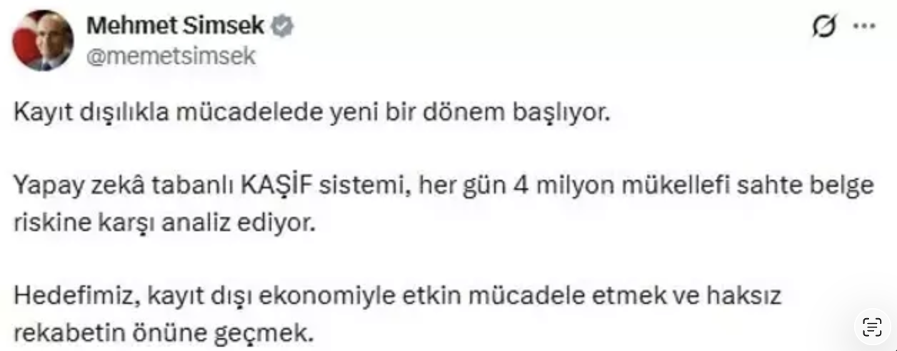 “Kayıt dışılıkla mücadelede yeni bir döneme girdik. Yapay zeka ve makine öğrenmesi gibi yeni teknolojilerle artık kayıt dışı tüm faaliyetleri anında tespit ediyor ve işlem yapıyoruz. Tüm mükelleflerimizi kayıt içinde kalmaya davet ediyorum.”