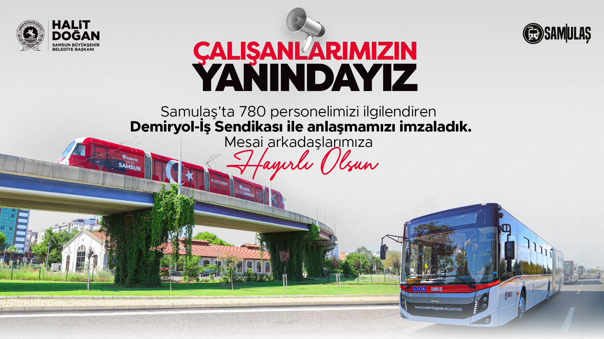 Samsun Büyükşehir Belediyesi çatısı altında toplu taşıma hizmeti sunan Samsun Proje Ulaşım İmar İnş. Yat. San. Tic. A.Ş (SAMULAŞ) bünyesinde 780 çalışanı ilgilendiren 2024 – 2026 dönemi Toplu İş Sözleşmesi görüşmeleri Demiryol-İş Sendikası ile imza altına alarak sonuçlandırıldı. İmzalanan Toplu İş Sözleşmesi ile evli, eşi çalışmayan ve çocuklu personelde en düşük işçi maaşı ikramiye dâhil 2025 Ocak ayı itibariyle yüzde 15 vergi diliminde 45 bin 498 TL’ye çıktı.