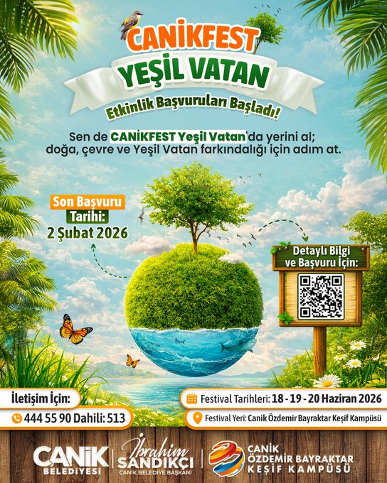Canik Belediyesi, bu yıl üçüncüsü düzenlenecek olan CANİKFEST Yeşil Vatan için eğitmen başvurularını başlattı. Doğa, çevre ve sürdürülebilir gelecek temalı festival, 18-20 Haziran 2026 tarihleri arasında gerçekleştirilecek.