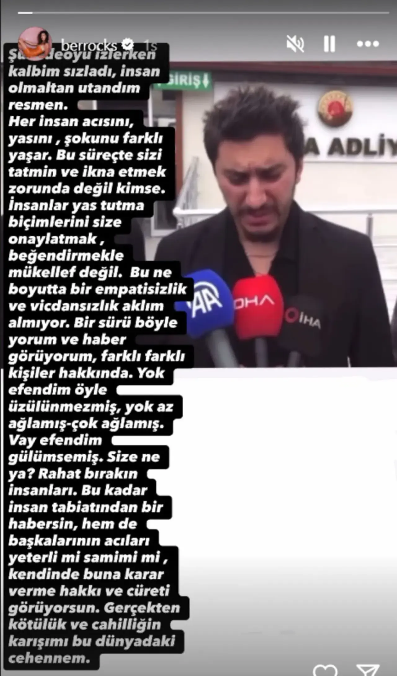 “Bir sürü yorum görüyorum: ‘Az ağlamış, çok gülmüş, yeterince üzülmemiş’… Size ne ya? Rahat bırakın insanları. Başkalarının acısının samimi olup olmadığını yargılama hakkınız yok. Bu, gerçek anlamda kötülük ve cahilliğin karışımı; dünyadaki cehennemden farksız.”