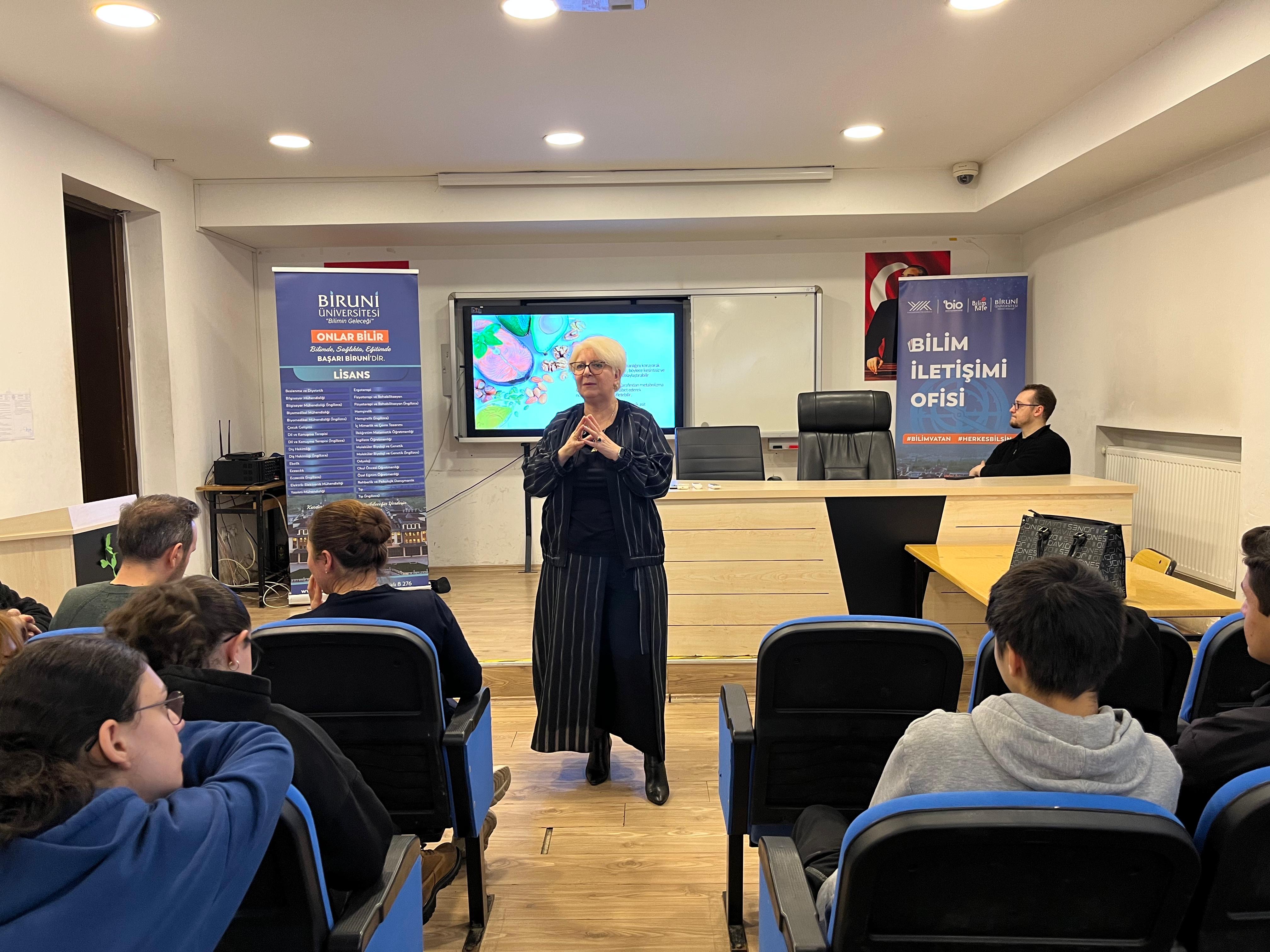 Biruni Üniversitesi Rektör Yardımcısı ve Beslenme ve Diyetetik Bölüm Başkanı Prof. Dr. Fatma Çelik, Bilim Kafe etkinlikleri kapsamında, "Gençlerde Beslenmenin Öğrenmeye Etkisi" başlıklı seminer vererek, bilimsel bilgileri sade ve anlaşılır bir dille aktardı.