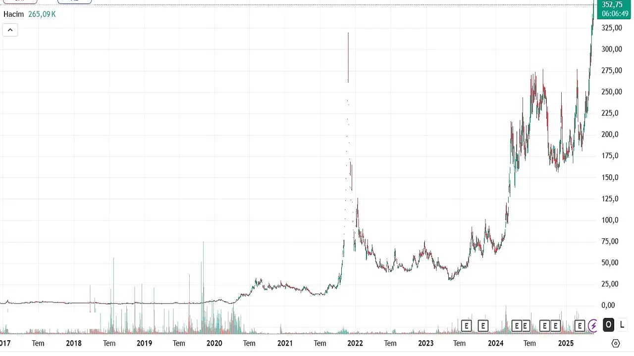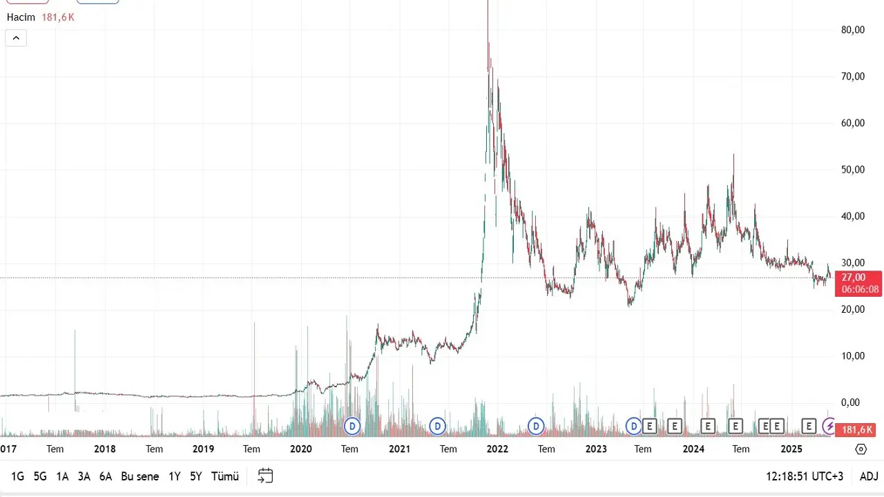 Benzer bir yükselişi 2021 yılında yapan ve 15 lira seviyesinin altından başladığı hareketi 300 liranın üzerine kadar taşıyarak 20X’lik bir hareket sergileyen DOBUR tahtasının sonrasındaki süreçte düşüşünün de bir hayli derin olduğu hatırlatılıyor.
