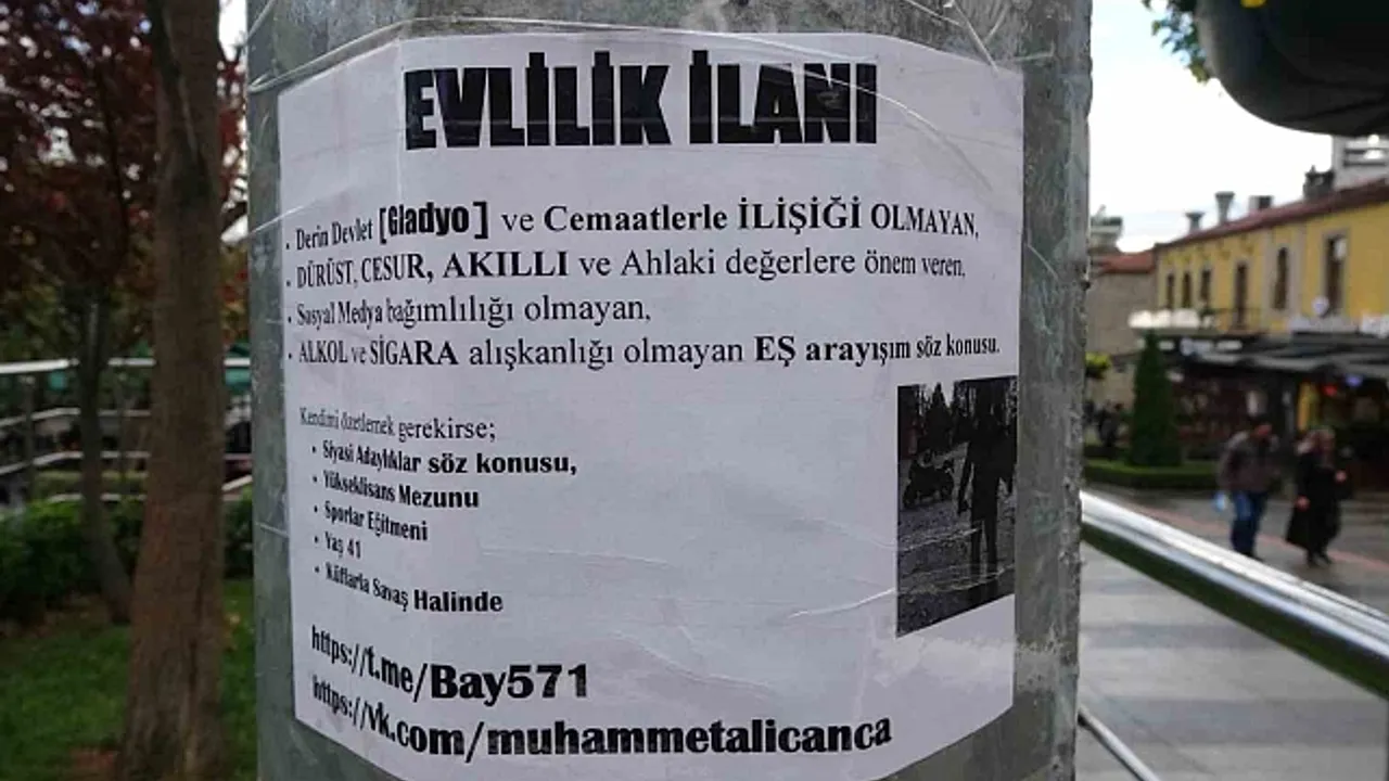 Atatürk Alanında bir direğe yapıştırılan 'Evlilik ilanı' yazısı görenlerin ilgisini çekiyor. A4 kağıdı büyüklüğündeki ilanda "Derin Devlet (Gladyo) ve cemaatlerle ilişiği olmayan, dürüst, cesur, akıllı, ve ahlaki değerlere önem veren, sosyal medya bağımlılığı olmayan, alkol ve sigara alışkanlığı olmayan eş arayışım söz konusu" bilgileri yer alıyor. Yazının devamında şahıs kendi özellikleri ile ilgili olarak ise "Kendimi özetlemek gerekirse; siyasi adaylıklar söz konusu, yüksek lisans mezunu, sporlar eğitmeni, yaş 41, küfflarla savaş halinde" ifadelerine yer verdi.