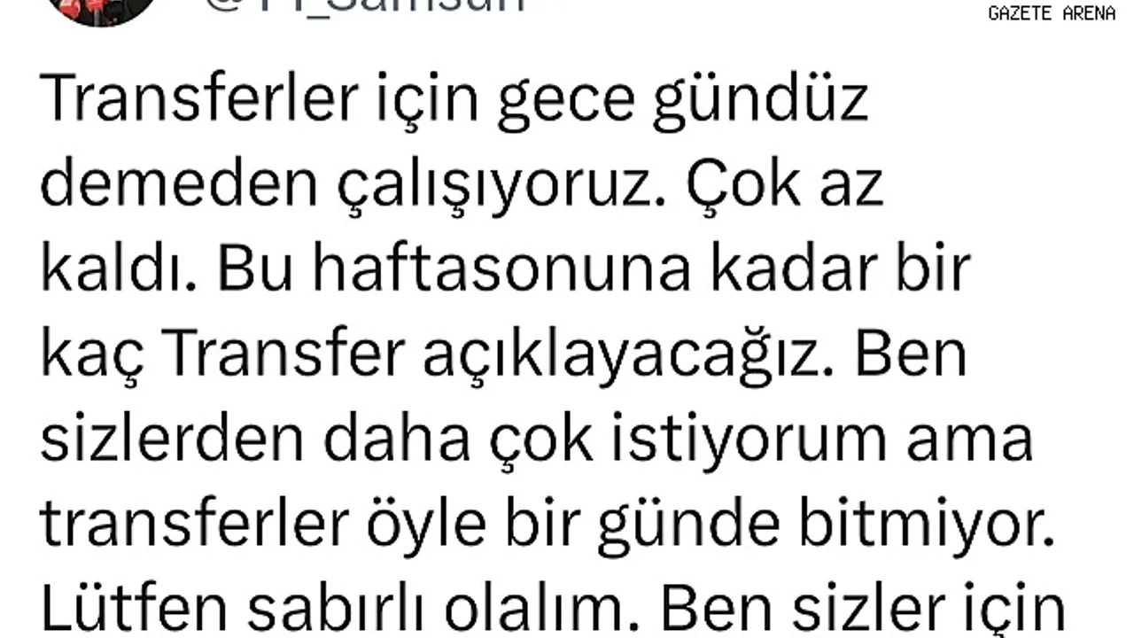 Trendyol Süper Lig takımlarından Samsunspor'da Başkan Yıldırım sosyal medya hesabından yaptığı açıklamada, "Transferler için gece-gündüz demeden çalışıyoruz. Çok az kaldı. Bu hafta sonuna kadar birkaç transfer açıklayacağız. Ben sizlerden daha çok istiyorum ama transferler öyle bir günde bitmiyor. Lütfen sabırlı olalım. Ben sizler için buradayım. Birlikte çok güzel işler yapacağız" ifadelerini kullandı.