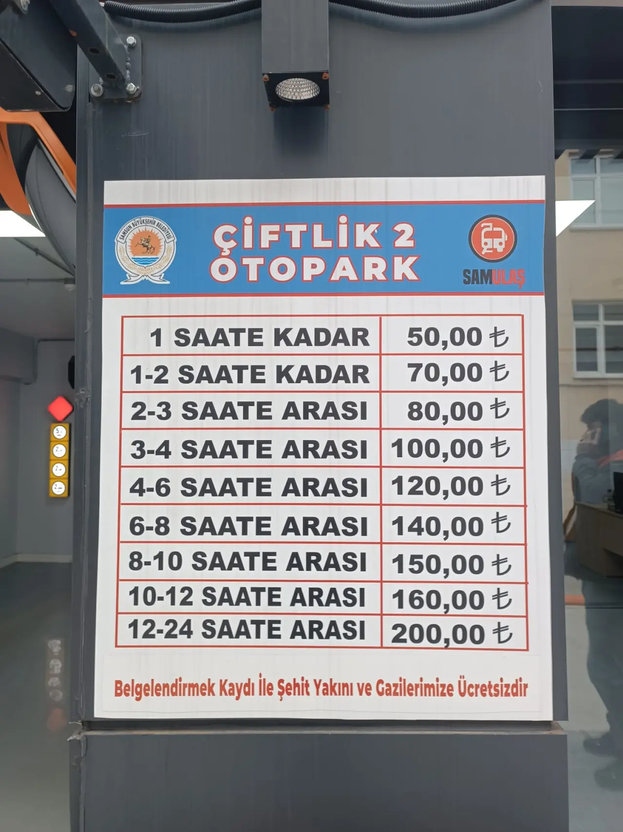 Samsun Büyükşehir Belediyesi'nin resmi sitesinde belediyeye ait otoparklar ve kapasiteleri şu şekilde yer aldı: Büyük Cami Katlı Otoparkı 130 araç. Kurtuluş Açık Otoparkı 330 araç. Ağabali Açık Otoparkı 80 araç. Cumhuriyet Meydanı Kapalı Otoparkı 210 araç. Gazi Kapalı Otoparkı 95 araç.Tekel Otoparkı 550 araç. İlçe Transfer Merkezi Açık Otoparkı 72 araç. Subaşı Mekanik Otoparkı 142 araç. Çarşamba Doğuyaka Mekanik Otoparkı 214 araç. Havza Kapalı Otoparkı 33 araç. Havza Mekanik Otoparkı 340 araç. P1 Otoparkı 75 araç. P2 Otoparkı 90 araç. P3 Otoparkı 100 araç. P4 Otoparkı 200 araç. Kentpark Otoparkı 25 araç. Fuar Caddesi Otoparkı 250 araç.
