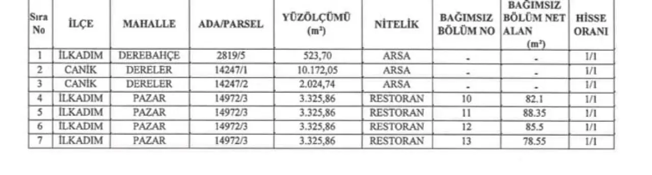 Samsun Büyükşehir Belediyesi, belediyenin iştirak şirketleri olan Samsun Anakent Turizm Ticaret A.Ş. ve Samsun Proje Ulaşım İmar İnş. Yat. San. ve Tic. A.Ş.'nin, Sosyal Güvenlik Kurumu'na olan prim borçlarına karşılık, mülkiyetinde bulunan bazı arsa ve restoran nitelikli taşınmazları, söz konusu şirketlerin SGK borçlarına karşılık olarak devredilecek.