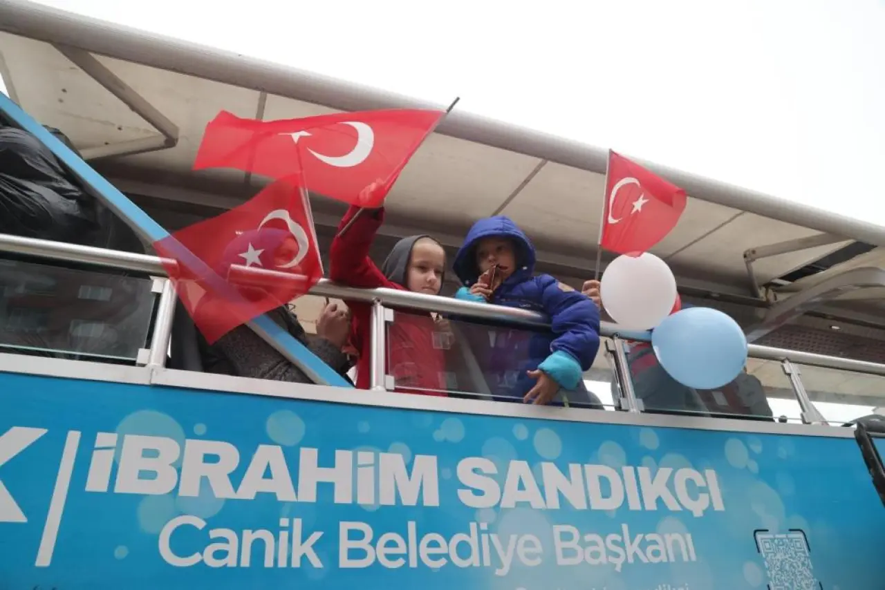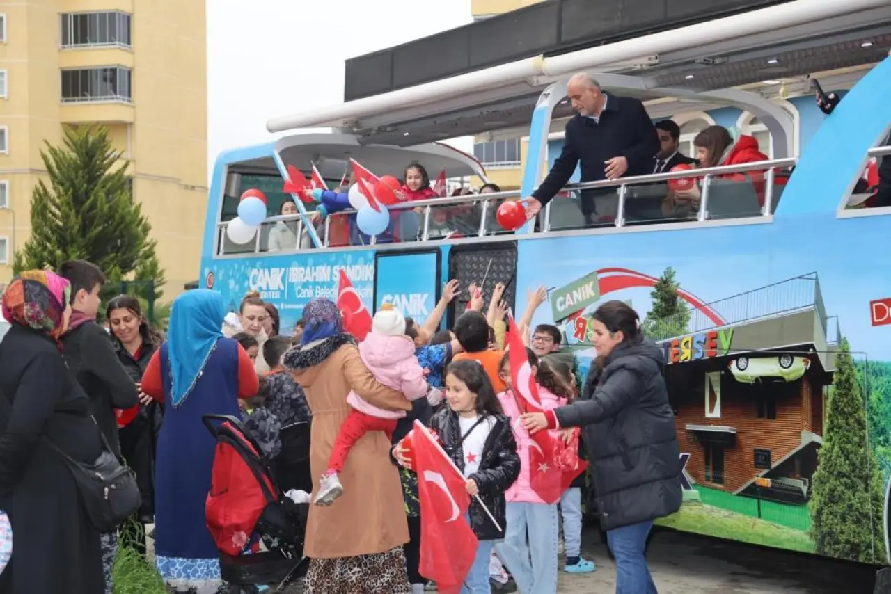 Çocuklarla beraber Canik'te otobüs turu yapan Başkan Sandıkçı, mahallelerde buluştuğu çocuklarla sohbet etti ve onlara hediyeler verdi. İlçede renkli görüntülere sahne olan kutlama programında otobüs turu esnasında balkonlara çıkan vatandaşlar ve çocuklar, otobüsten çalan marşlara ellerinde Türk bayrakları ile eşlik etti.