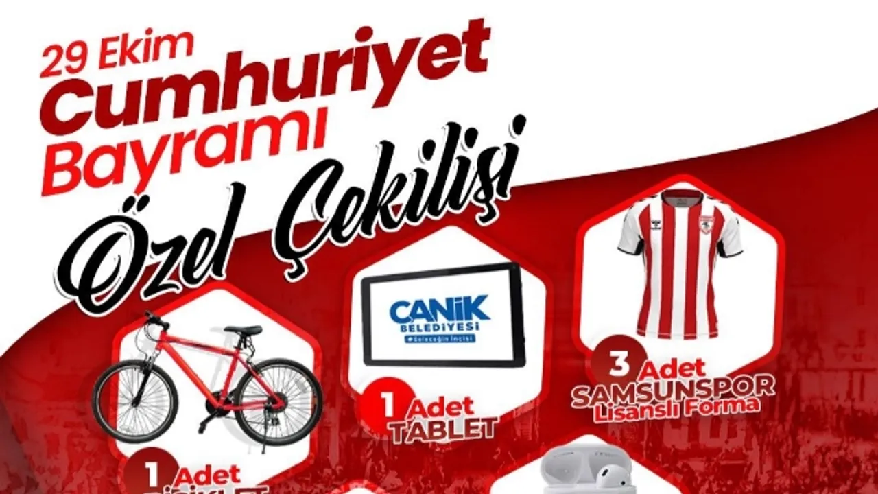 29 Ekim Cumhuriyet Bayramı'na özel çekiliş programı düzenleyen Canik Belediyesi, vatandaşlara bisiklet, tablet bilgisayar, Samsunspor lisanslı forma, akıllı saat ve kulak içi bluetooth kulaklık hediye edecek. Canik Belediye Başkanı İbrahim Sandıkçı ve Canik Belediyesi sosyal medya hesapları üzerinden düzenlenen çekiliş programına vatandaşlar, 29 Ekim 2024 Salı günü saat 23.59'a kadar başvuruda bulunabilecek.