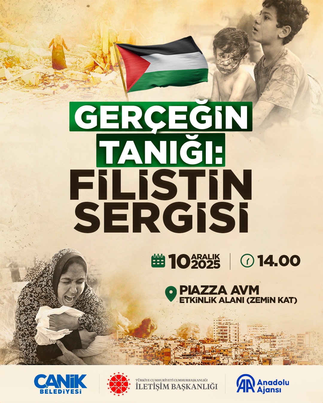 Cumhurbaşkanlığı İletişim Başkanlığı ve Anadolu Ajansı iş birliğiyle hazırlanan “Gerçeğin Tanığı: Filistin Sergisi”, İsrail’in Filistin’de sebep olduğu soykırım, bebek ve çocuk ölümleri ile yaşam hakkına yönelik ihlalleri ele alan mesajlarıyla dikkat çekiyor. Anadolu Ajansı’nın “Kanıt” isimli kitabında yayımlanan fotoğrafların yer aldığı sergide ayrıca “Gerçeği Gör, Sessiz Kalma” adlı kısa film gösterimi yapılacak. Sergi, 10 Aralık 2025 Çarşamba günü saat 14.00’te kapılarını açacak ve program kapsamında uzman isimler dezenformasyonla mücadele konusunda bilgilendirmelerde bulunacak.