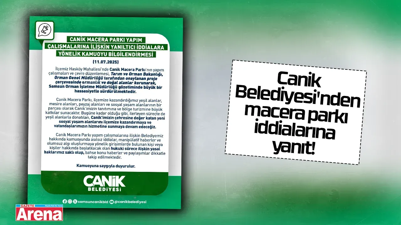 Samsun’un Canik ilçesinde yapımı süren Canik Macera Parkı projesi hakkında kamuoyunda çıkan bazı iddialar üzerine Canik Belediyesi’nden yazılı açıklama geldi. Belediye, projeyle ilgili çalışmaların Tarım ve Orman Bakanlığı onayı ve Samsun Orman İşletme Müdürlüğü gözetiminde sürdürüldüğünü vurguladı.