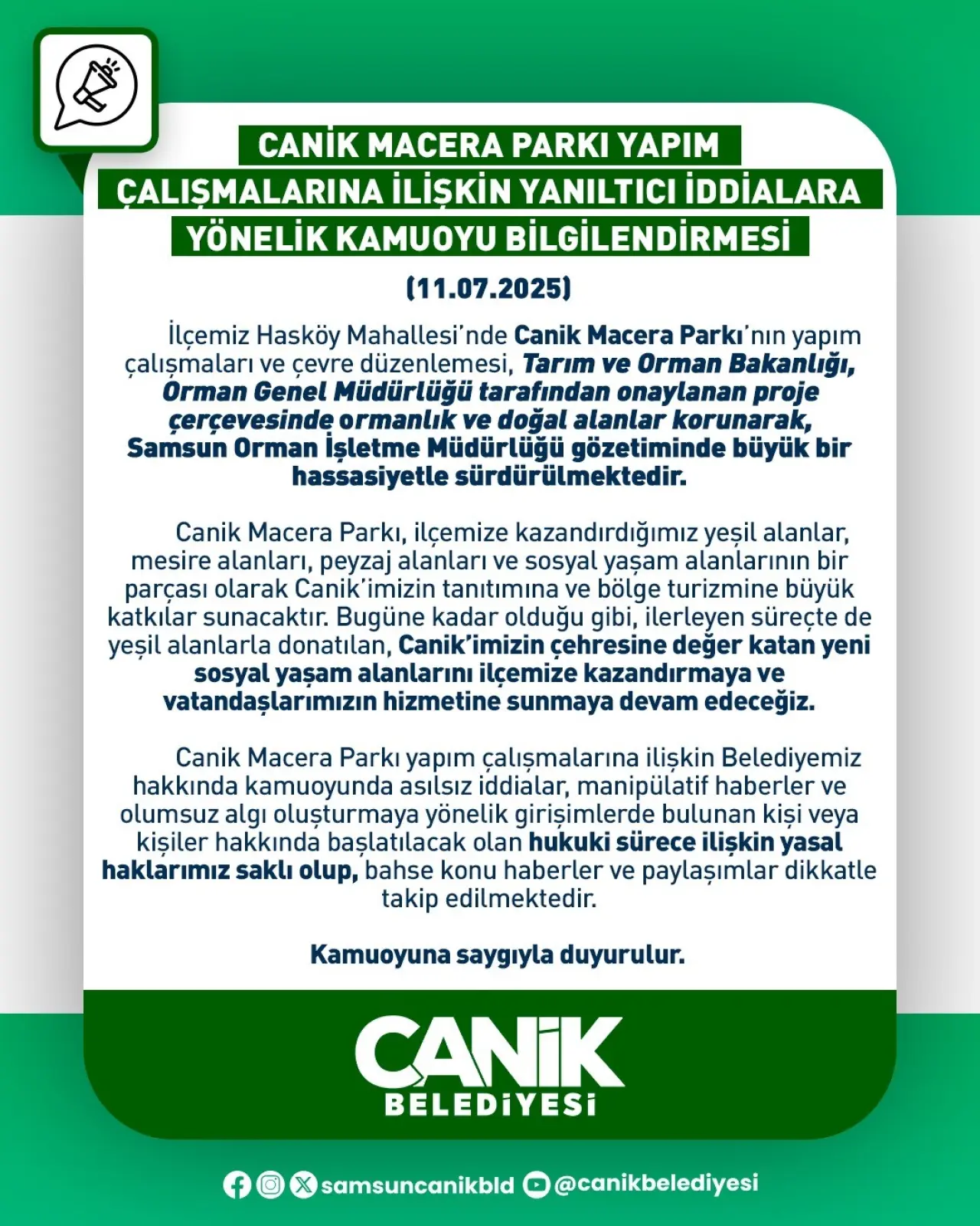 “İlçemiz Hasköy Mahallesi’nde yapımı süren Canik Macera Parkı’nın çalışmaları, doğal ve ormanlık alanlara zarar verilmeden, resmi kurumların onayladığı proje kapsamında yürütülmektedir.”