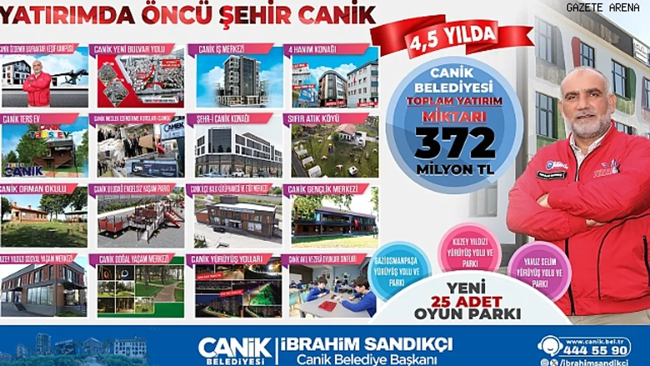 4.5 yılda ilçeye çok önemli projeler kazandırdıklarını belirten Canik Belediye Başkanı İbrahim Sandıkçı, Canik’i yeni proje ve yatırımlarla yeni kimliğine kavuşturduklarını ifade etti. Başkan İbrahim Sandıkçı, Canik Belediyesi olarak ilçeye kazandırdıkları Canik Özdemir Bayraktar Keşif Kampüsü, Yeni Bulvar Yolu, Canik İş Merkezi, 4 adet yeni Hanım Konağı, Canik Ters Ev, Canik Meslek Edindirme Kursları (CAMEK), Şehr-i Canik Konağı, Canik Sıfır Atık Köyü, Canik Orman Okulu, Samsun’un en kapsamlı engelsiz parkı olan Uludağ Engelsiz Yaşam Parkı dâhil 25 yeni park, Canik İlçe Halk Kütüphanesi, Canik Gençlik Merkezi, Kuzey Yıldızı Sosyal Yaşam Merkezi, Canik Doğal Yaşam Merkezi, Yürüyüş Yolları ve Canik Akıl ve Zekâ Oyunları Sınıfları ile ilçeye yeni bir imaj kazandırdıklarının altını çizdi.