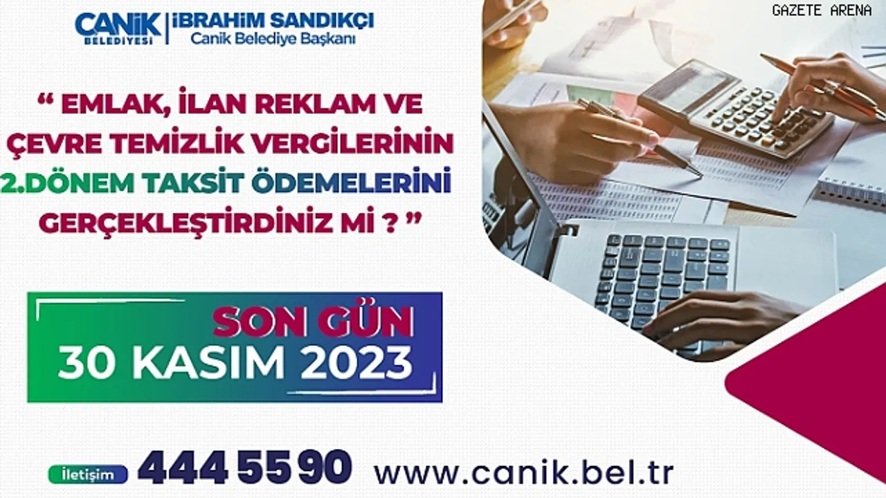 Canik Belediyesi, emlak, çevre temizlik, ilan ve reklam vergilerinin ikinci taksit ödemelerinin son günü 30 Kasım 2023 olduğunu hatırlatarak mükelleflere çağrıda bulundu.