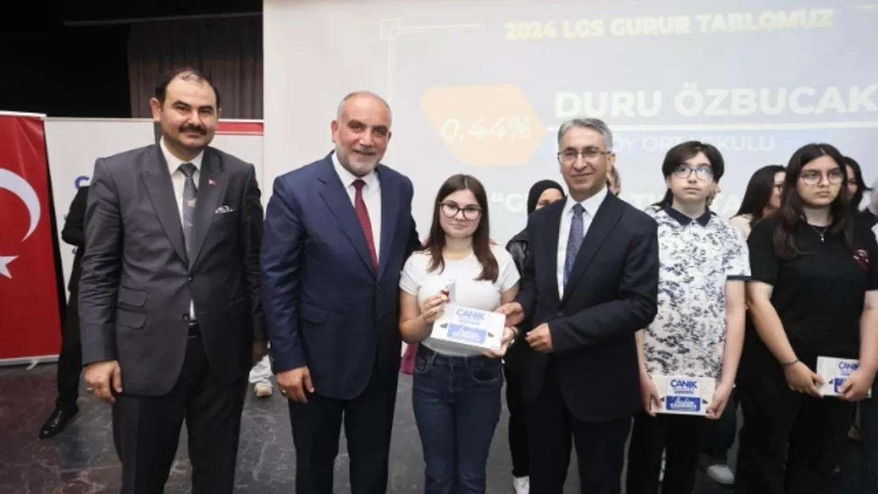 Canik Belediyesi YKS-LGS Ödül Töreni’nde Canik’te okuyup 2024 YKS’de ilk 500’e giren öğrencilere dizüstü bilgisayar, 5 bine giren öğrencilere cep telefonu, 50 bine giren öğrencilere tablet ödülü verilirken,  2024 LGS’de ise Canik’te okuyan ve yüzde 1’lik dilime giren öğrencilere tablet ile gram altın, yüzde 5’lik dilime giren öğrencilere tablet, yüzde 10’luk dilime giren öğrencilere ise akıllı saat hediye edildi.