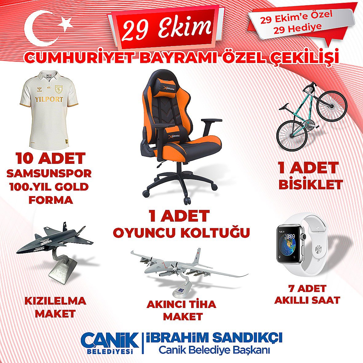Yurt genelinde gerçekleştirdiği çekiliş programlarıyla vatandaşları sevindiren Canik Belediyesi tarafından Cumhuriyetin 100. yılına özel düzenlenen 29 Ekim Cumhuriyet Bayramı Özel çekilişi yoğun ilgiyle devam ediyor. Vatandaşlar, Canik Belediye Başkanı İbrahim Sandıkçı ve Canik Belediyesi sosyal medya hesapları üzerinden düzenlen çekişile birbirinden özel hediyelerin sahibi olacak. 1 adet oyuncu koltuğu, 10 adet Samsunspor 100. Yıl Gold Forma, 1 Adet bisiklet,  10 adet Kızılelma maket, 10 adet Akıncı TİHA maket ve 7 adet akıllı saatin hediye edileceği 29 Ekim Cumhuriyet Bayramı Özel Çekilişi, 28 Ekim Cumartesi günü saat 23.59’da son bulacak.