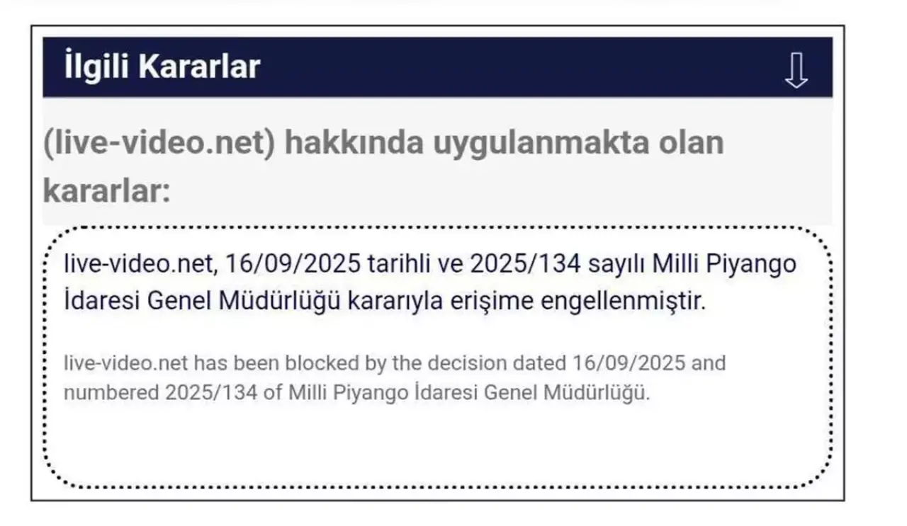 Kararda, “live-video.net, 16/09/2025 tarihli 2025/134 sayılı Milli Piyango İdaresi Genel Müdürlüğü kararıyla erişime engellenmiştir.” ifadesi yer alıyor. Ancak engelin gerekçesi henüz resmi olarak açıklanmadı.