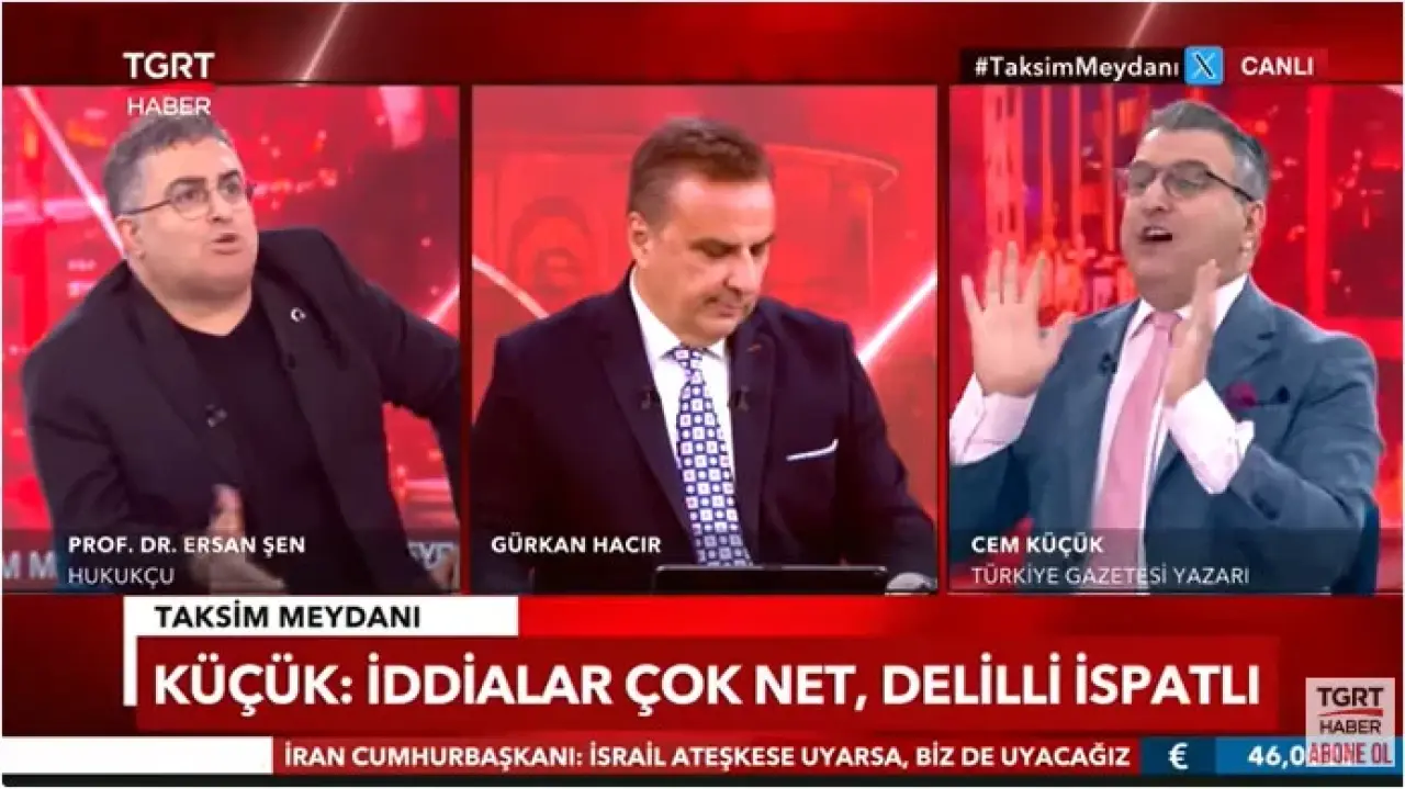 TGRT ekranlarında yayımlanan Taksim Meydanı programı, İstanbul Büyükşehir Belediyesi’ne yönelik soruşturmalar ve Fatih Altaylı’nın tutuklanmasının konuşulduğu anlarda büyük bir tartışmaya sahne oldu. Gazeteci Cem Küçük ile ceza hukukçusu Prof. Dr. Ersan Şen’in karşı karşıya geldiği programda tansiyon bir anda yükseldi.