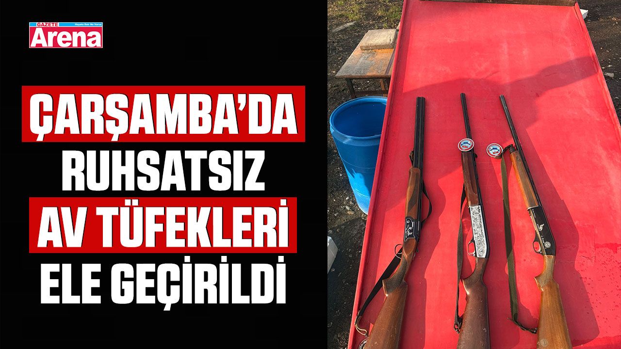 Samsun’un Çarşamba ilçesinde Asayiş Şube Müdürlüğü Yunus Timleri tarafından yürütülen çalışmalar sırasında, avlanmak amacıyla seyir hâlindeyken durdurulan iki şahsın üzerinde ve araçlarında yapılan kontrollerde 3 adet ruhsatsız av tüfeği ele geçirildi.