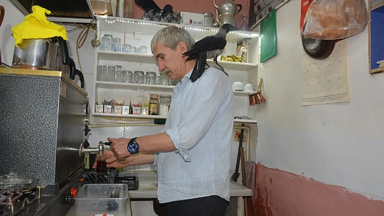 Çay ocağının maskotu Paşa isimli karga ile sahibinin ilginç dostluğu