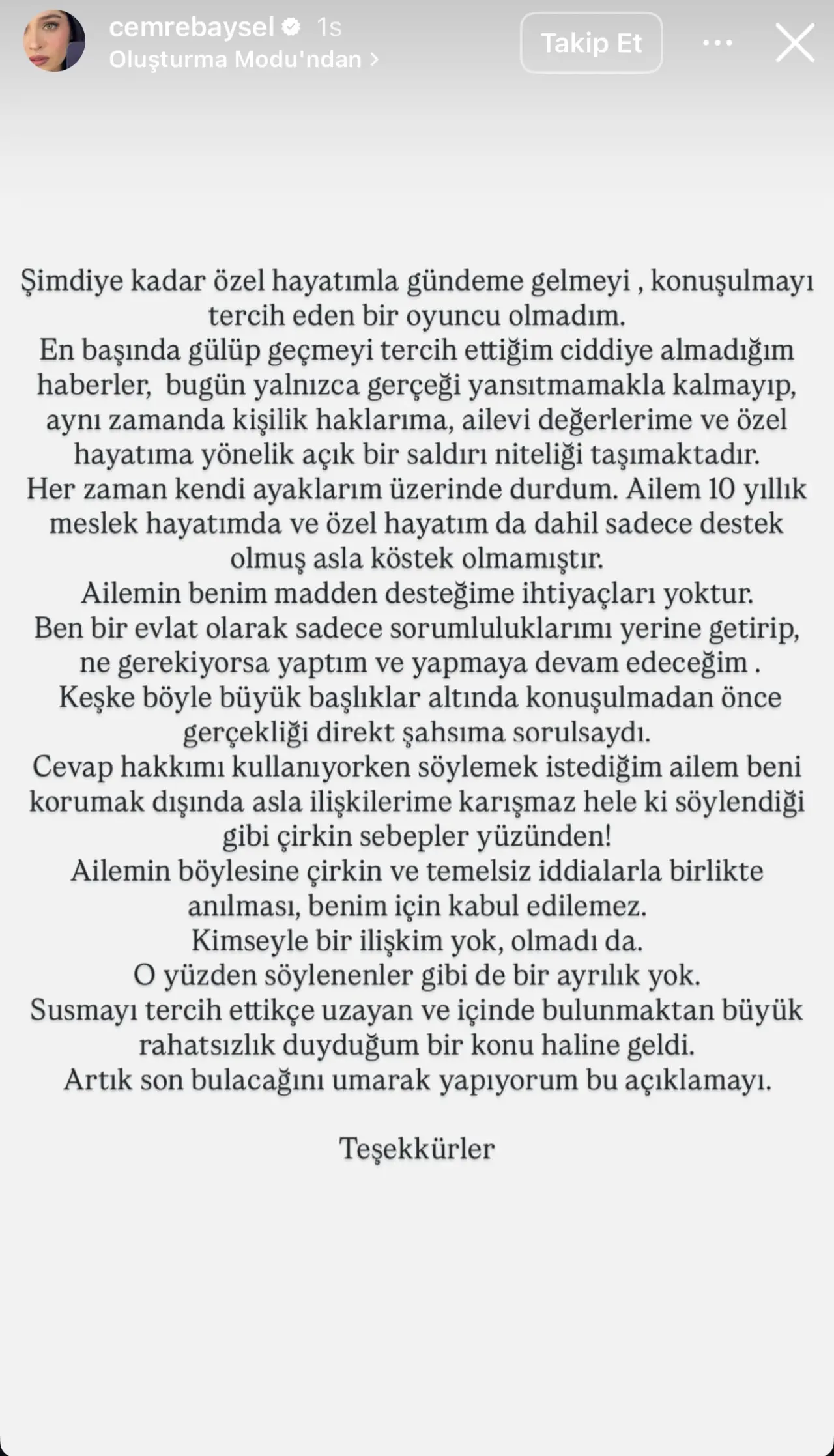 Cemre Baysel, Instagram hikâyesinde yayımladığı uzun açıklamada, kariyerinin başından bu yana her zaman kendi ayakları üzerinde durduğunu ifade etti. Oyuncu, ailesinin kendisine sadece manevi destek verdiğini, hiçbir zaman özel hayatına veya meslek hayatına müdahale etmediğini vurguladı: