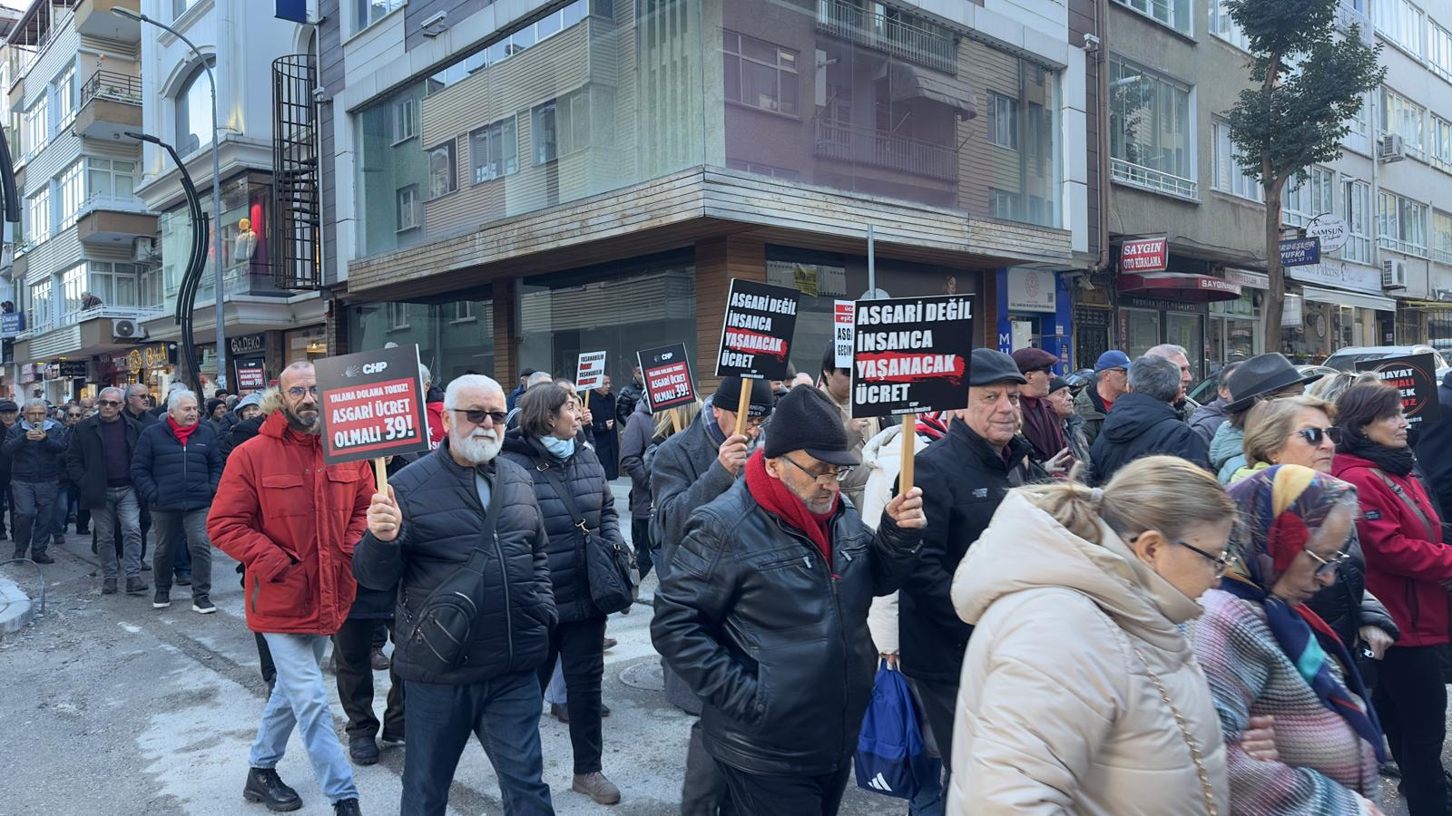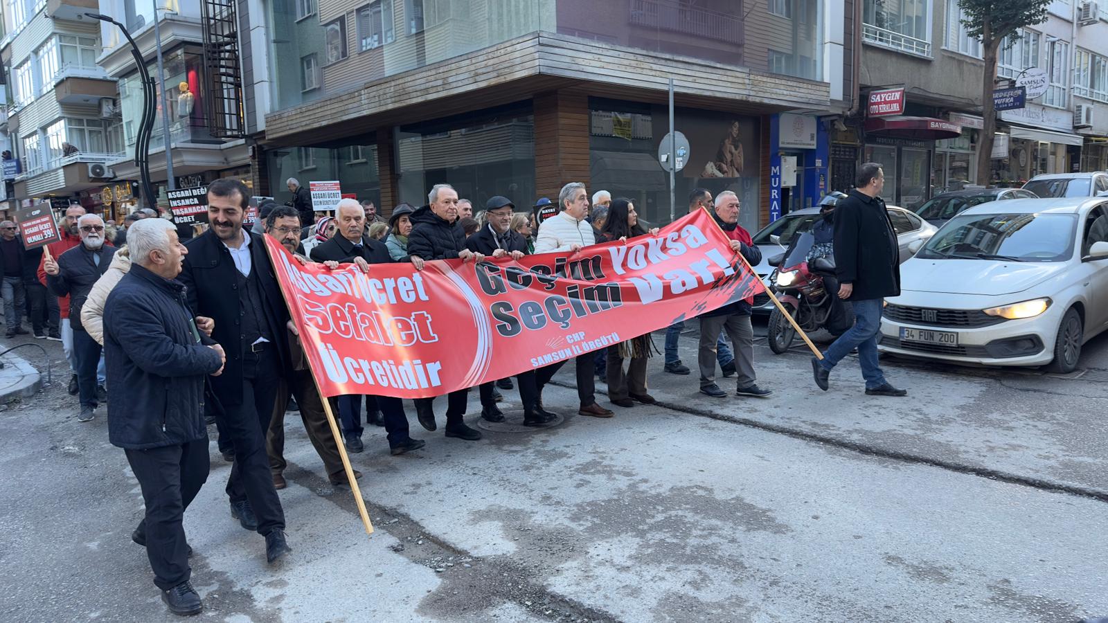 CHP Samsun İl Başkanlığı öncülüğünde düzenlenen protestoya katılan vatandaşlar, "asgari ücret 39 bin olmalı," "asgari değil insanca yaşanacak ücret," "geçim yoksa, seçim var," ve "asgari ücret sefalet ücretidir." sloganları ile yürüyüş gerçekleştirildi.