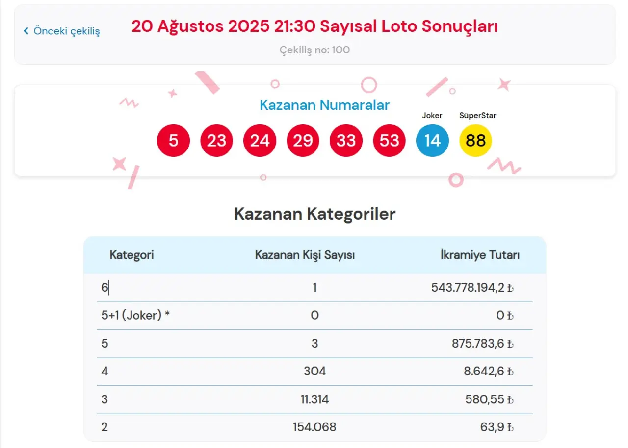 Çılgın Sayısal Loto 20 Ağustos Çarşamba İkramiye Miktarları: Kim Ne Kadar İkramiye Kazandı?