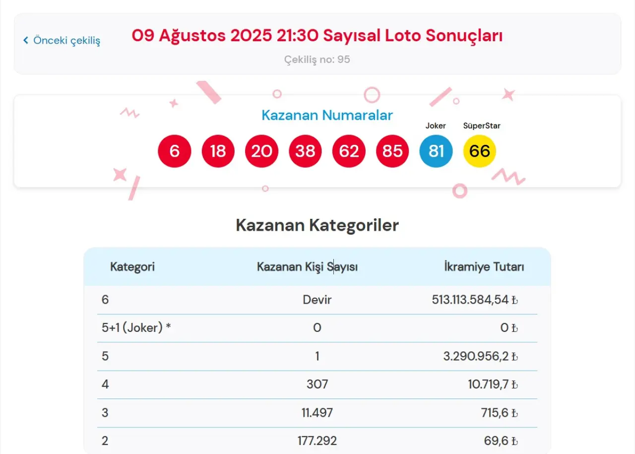 6 – 18 – 20 – 38 – 62 – 85 + 81 (JOKER) + 66 (SÜPER STAR)