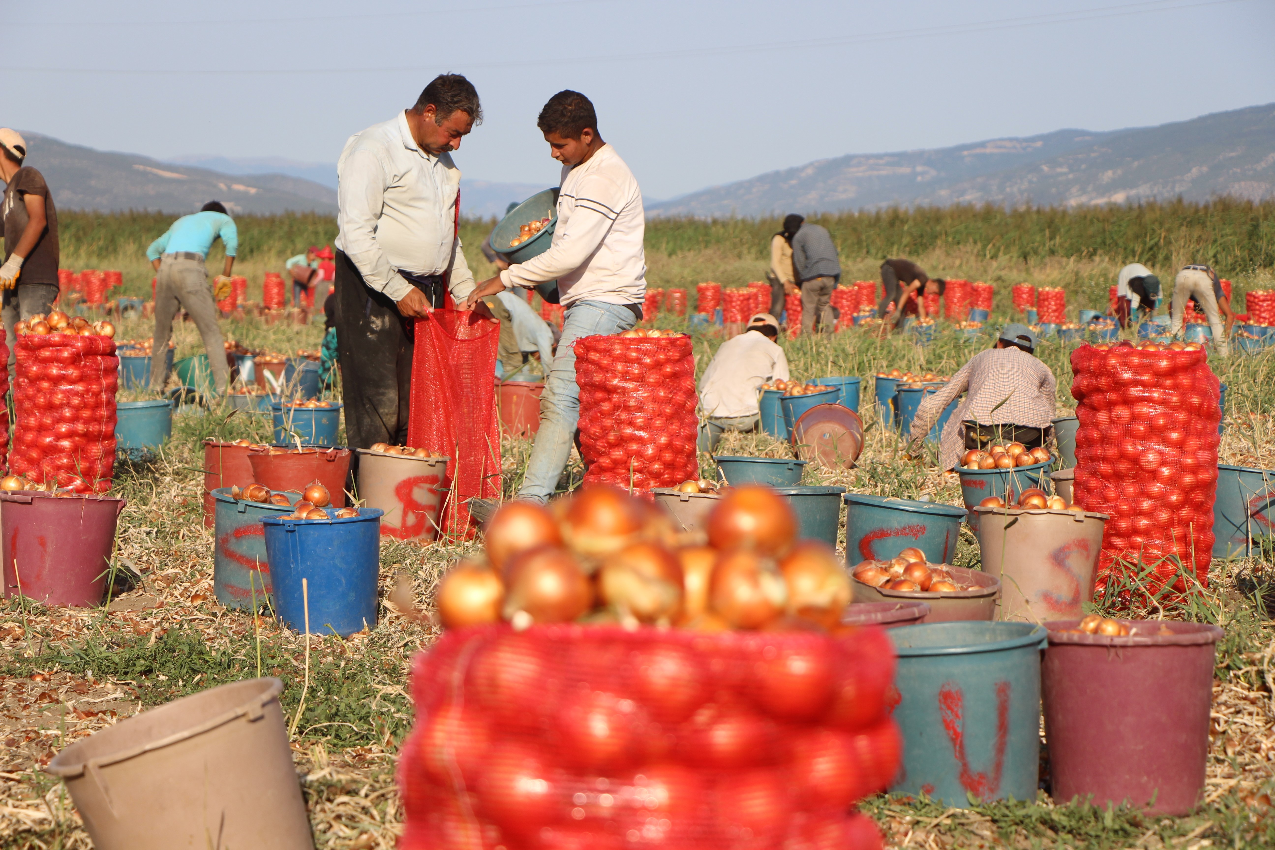 Amasya'da soğan hasadı aşırı sıcak altında devam ediyor. Bu dönemde turizmde yoğunluğun görüldüğü deniz kıyısındaki kentler başta olmak üzere yurdun dört bir yanına gönderilen kuru soğan, üreticiler tarafından ‘kırmızı altın’ olarak nitelendiriliyor. Bir önceki yıla göre ekim alanı fazla olan soğanda aşırı yağışların etkisiyle verim düşüklüğü görüldüğünü belirten soğan üreticisi Oğuz Çelik, “Soğan bu yıl hasat başlarında fiyatıyla biz üreticisini sevindirdi. Şimdiyse düşüşe geçti. Kilosu tarlada 4 TL ile 6 TL arasında satılıyor” diye konuştu.