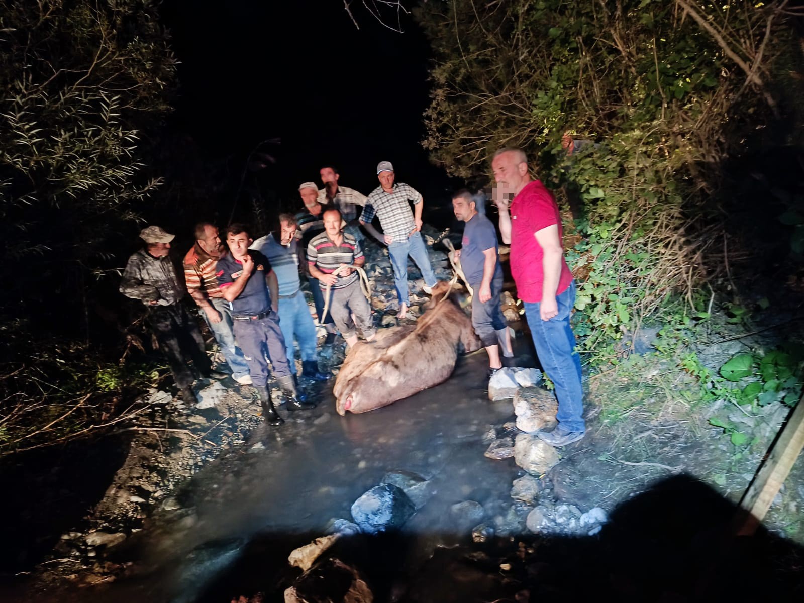Edinilen bilgiye göre, Şükrü Kaya’ya ait inek araziden dönerken ayağının kayması neticesinde köprüden dereye düştü. İneği kurtarmak için çalışan köy sakinleri, çabalarında başarılı olamayınca 112 Acil Çağrı Merkezini arayarak istedi.