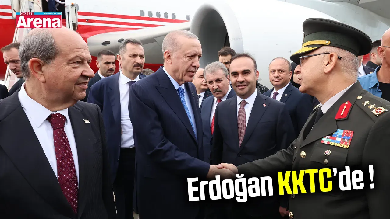 Erdoğan’ı taşıyan uçak saat 13.50 sıralarında Ercan Havalimanı’na iniş yaptı. Erdoğan, KKTC Cumhurbaşkanı Ersin Tatar tarafından resmi törenle karşılandı. Karşılama heyetinde;