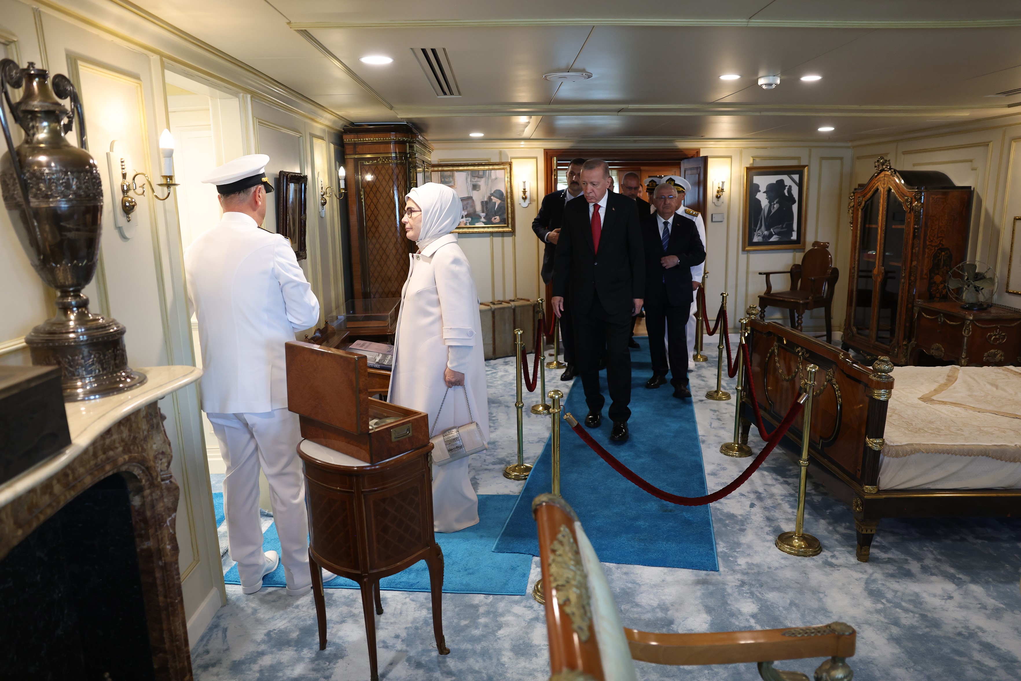 Tüm yenileme sürecini yakından takip eden Cumhurbaşkanı Erdoğan, eşi Emine Erdoğan ile birlikte tadilat sonucunu görmek için Savarona yatında incelemelerde bulundu.