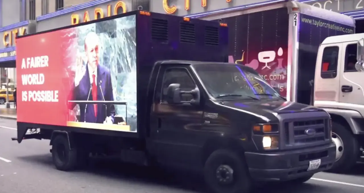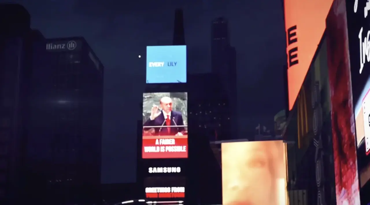 Cumhurbaşkanlığı İletişim Başkanlığı koordinasyonuyla New York’un merkezinde yer alan cadde ve sokaklardaki dev ekranlarda Erdoğan’ın “A Fairer World Is Possible” (Daha Adil Bir Dünya Mümkün) sözleri yer aldı. Bu anlar hem sosyal medyada hem de uluslararası medyada büyük ilgi gördü.