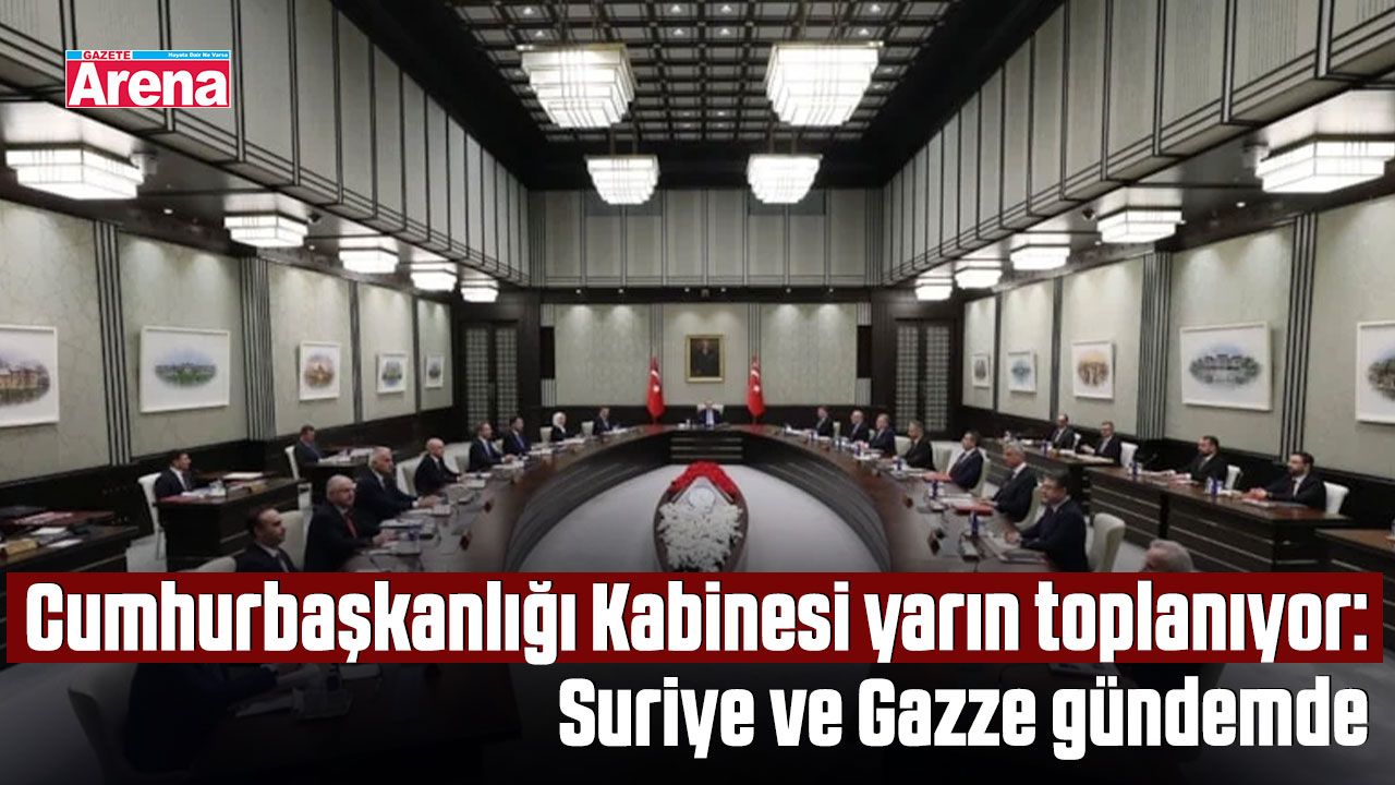 Cumhurbaşkanı Recep Tayyip Erdoğan başkanlığında yarın Ankara Beştepe’de toplanacak Cumhurbaşkanlığı Kabinesi’nin gündeminde Suriye ve Gazze konuları ön plana çıkıyor. Toplantıda ayrıca Terörsüz Türkiye süreci ve ekonomi ile ilgili gelişmeler de ele alınacak.