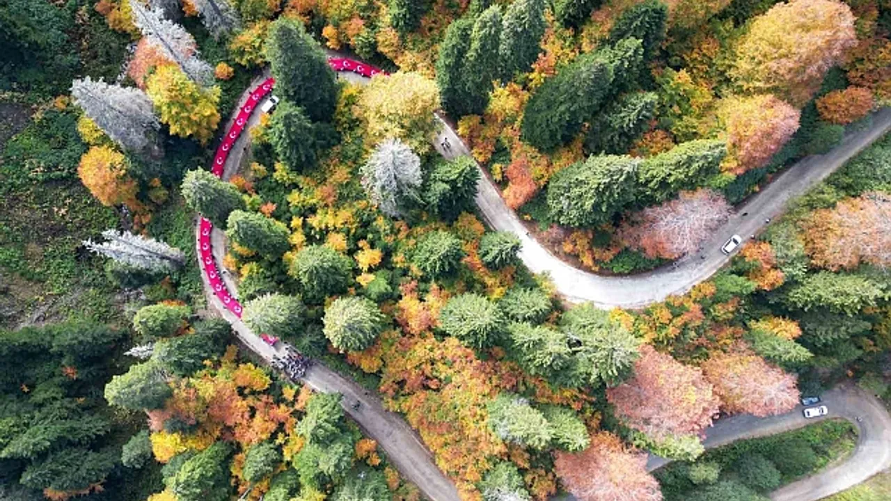 Gümüşhane'de Cumhuriyetin 100. yılı kutlamaları kapsamında Vali Alper Tanrısever'in de katılımıyla 300'ü aşkın genç sonbaharın büyülü renklerine bezenen Örümcek Ormanları'nda 100 metrelik Türk Bayrağını 7,5 kilometre taşıyarak yürüdü.
