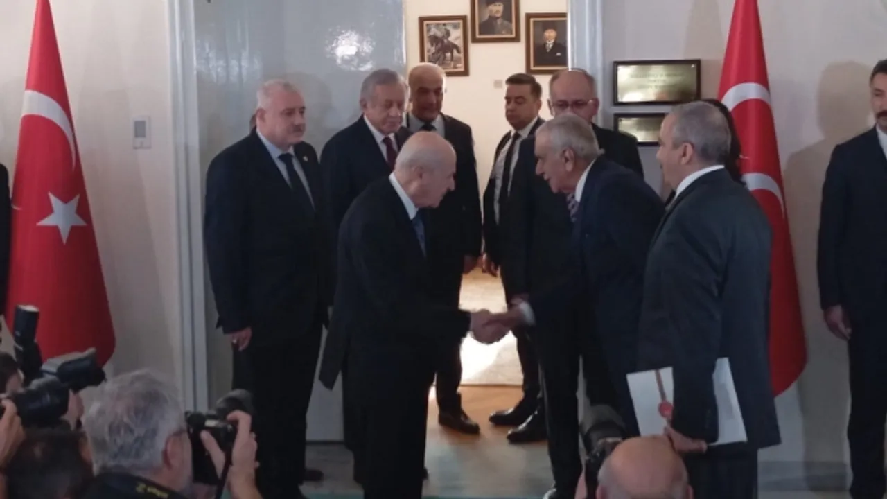 İstanbul Milletvekili Sırrı Süreyya Önder, Van Milletvekili Pervin Buldan ve eski Mardin Büyükşehir Belediye Başkanı Ahmet Türk’ten oluşan DEM Parti heyeti, İmralı’da terör örgütü PKK’nın elebaşı Abdullah Öcalan ile yapılan görüşmenin ardından TBMM Başkanı Numan Kurtulmuş ile gün içerisinde görüşme gerçekleştirmişti. Heyet, Kurtulmuş ile olan görüşmesinin ardından TBMM’de MHP Genel Başkanı Devlet Bahçeli ile bir araya geldi. Bahçeli’nin TBMM’deki makamında gerçekleşen görüşme öncesinde Bahçeli, DEM Partili heyeti kapıda karşılayarak, heyetle tokalaştı. Görüşmede Bahçeli’ye MHP İstanbul Milletvekili Celal Adan da eşlik etti. Basına kapalı gerçekleşen görüşme 40 dakika sürerken, görüşmelerin ardından herhangi bir açıklama yapılmadı. DEM Parti İstanbul Milletvekili Sırrı Süreyya Önder, pazartesi günü AK Parti, CHP ve TBMM’de temsil edilen diğer partileri ziyaret edeceklerini de açıklamıştı.