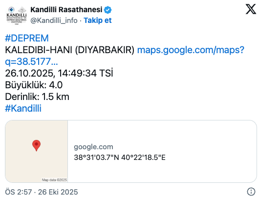 Afet ve Acil Durum Yönetimi Başkanlığı (AFAD), Diyarbakır’ın Hani ilçesinde saat 14.49’da 4 büyüklüğünde bir deprem meydana geldiğini duyurdu. AFAD’ın internet sitesinde yer alan bilgiye göre, depremin merkez üssü Hani olarak belirlenirken, sarsıntı 13,15 kilometre derinlikte gerçekleşti.