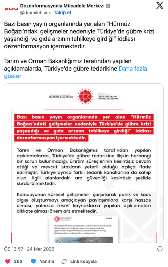 Cumhurbaşkanlığı İletişim Başkanlığı bünyesindeki Dezenformasyonla Mücadele Merkezi (DMM), son günlerde sosyal medyada gündeme gelen “Türkiye’de gübre krizi yaşanıyor” iddialarının gerçeği yansıtmadığını açıkladı.