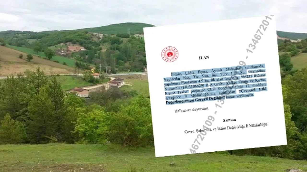 Konuyla ilgili Samsun Çevre, Şehircilik ve İklim Değişikliği İl Müdürlüğü'nce yayınlanan ilanda; "İlimiz, Lâdik İlçesi, Ayvalı Mahallesi sınırlarında, Yaylacılar Nak. Tic. San. İnş. Turz. Ltd. Şti. tarafından yapılması Planlanan 4,9 ha.’lık alan üzerinde, "86233 Ruhsat Numaralı (ER:3106829) II-A Grubu Kalker Ocağı ve Kırma Eleme Tesisi” projesine ÇED Yönetmeliği'nin 17. maddesi gereğince İl Müdürlüğümüz tarafından “Çevresel Etki Değerlendirmesi Gerekli Değildir” kararı verilmiştir" denildi.