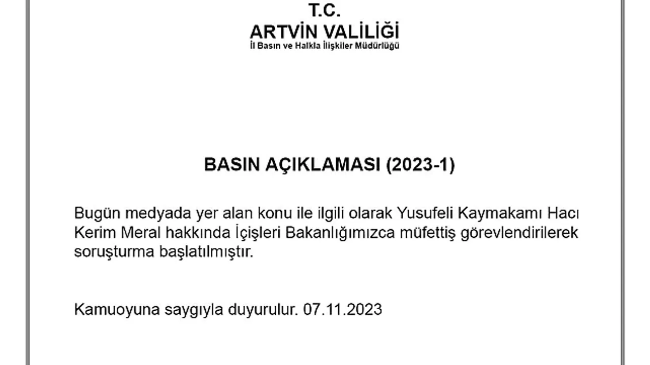Artvin'in Yusufeli ilçesinde görev yapan Kaymakam Hacı Kerim Meral, iddialara göre yemek yediği restoranda döneri beğenmedim diyerek hesabı ödemedi. Konu gündem olurken, İçişleri Bakanlığı tarafından konuyla ilgili soruşturma başlatılırken, Artvin Valiliğinden açıklama yapıldı. Açıklamada, "Bugün medyada yer alan konu ile ilgili Yusufeli Kaymakamı Hacı Kerim Meral hakkında İçişleri Bakanlığımızca müfettiş görevlendirilerek soruşturma başlatıldı. Kamuoyuna saygıyla duyurulur" denildi.