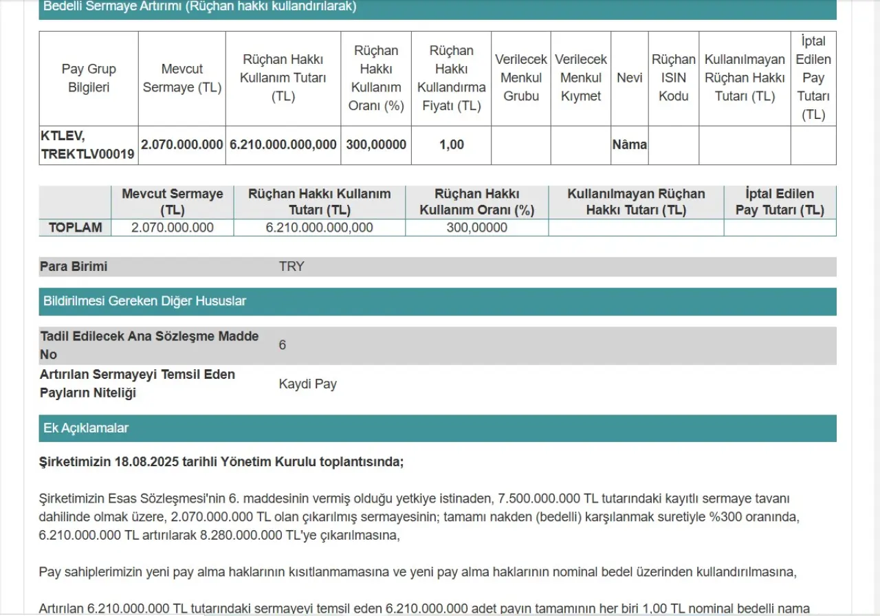 6 milyar 210 milyon liralık sermaye artırımı tutarı, şirketin paydaşları tarafından karşılanacak. Bedelli sermaye artırımı için, portföyünde KTLEV hisse bulunan yatırımcılara rüçhan hakkı tanımlanacak.