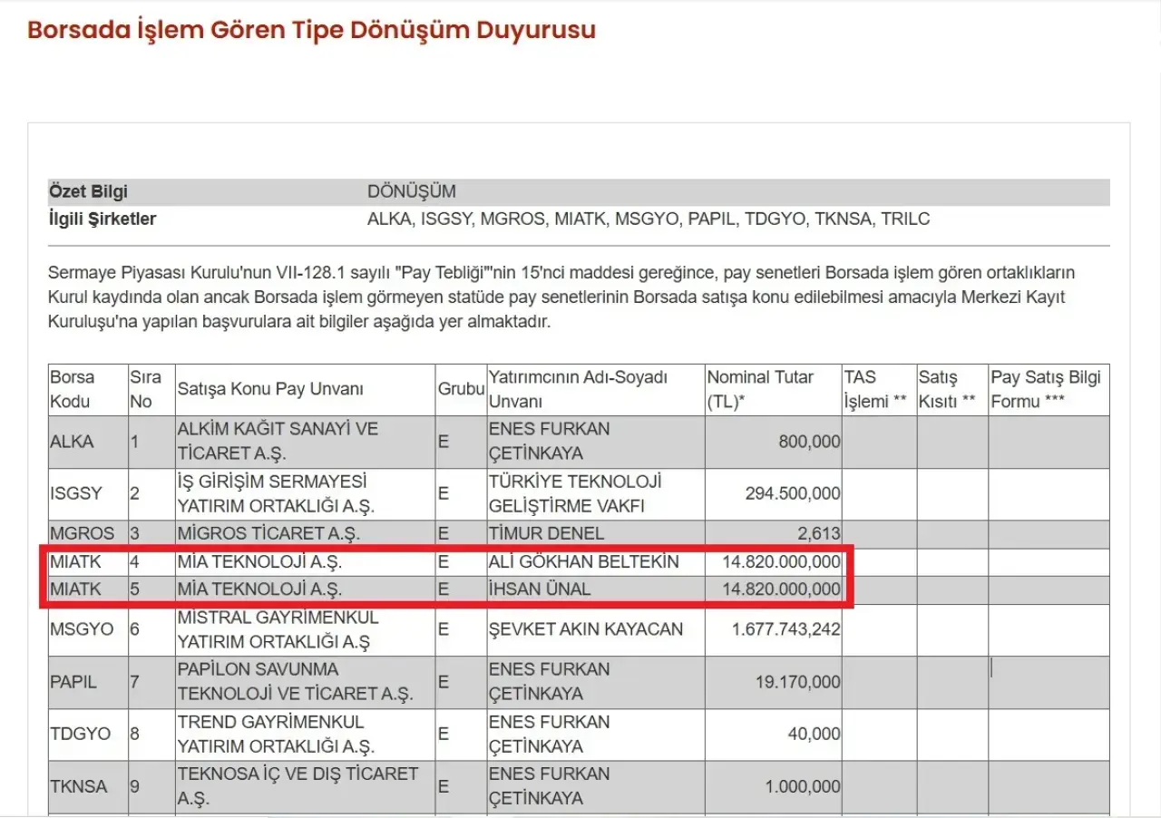 • Ortakların Pay Satışı: Mia Teknoloji’nin Yönetim Kurulu Başkanı Ali Gökhan Beltekin ve firmanın Yönetim Kurulu Başkan Yardımcısı İhsan Ünal, şirkette son 1 yılda önemli hisse satışları gerçekleştirdi. Geçtiğimiz yıl hisse fiyatı 60 liranın üzerindeyken yapılan hisse satışı sonrasında Miatek paylarındaki düşüş hızlandı. Geçtiğimiz hafta ise, her 2 isim, uhdelerinde bulunan halka açık olmayan lotlardan 14 milyon 820’şer bin adet hisseyi borsada işlem gören tipe dönüştürdü.
