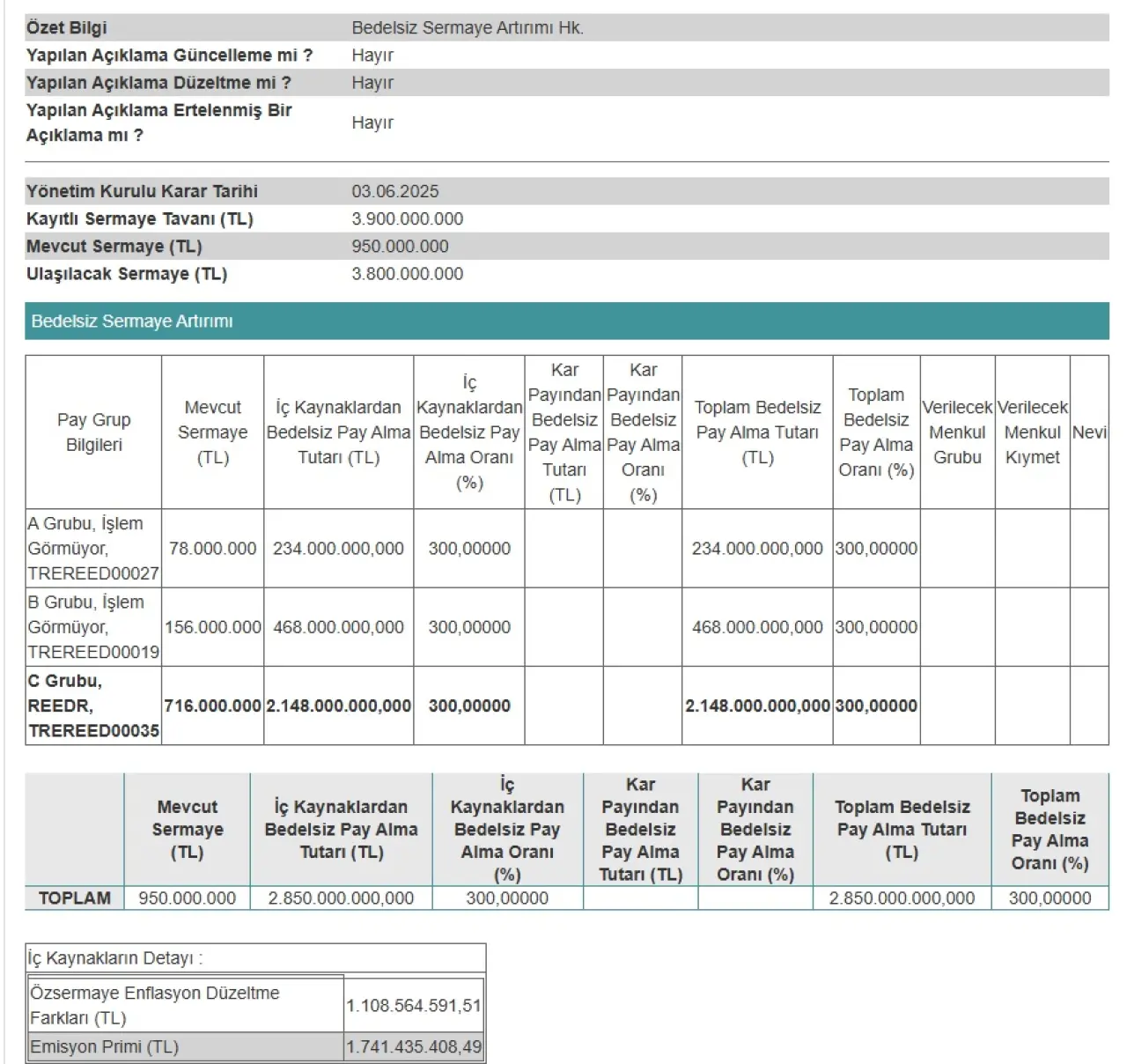 Reeder Teknoloji Sanayi ve Ticaret A.Ş’nin güncel olarak ödenmiş sermayesi 950 milyon TL düzeyinde bulunuyor. Firmanın kayıtlı sermaye tavanı ise 3,9 milyar lira. Reeder Teknoloji, iç kaynaklarından yapacağı 2 milyar 850 milyon liralık sermaye artışı ile, ödenmiş sermayesini 3,8 milyar TL noktasına taşıyacak. Firmanın iç kaynaklarından karşılayacağı bedelsiz sermaye artırımı fonu şu kalemlerden gelecek: