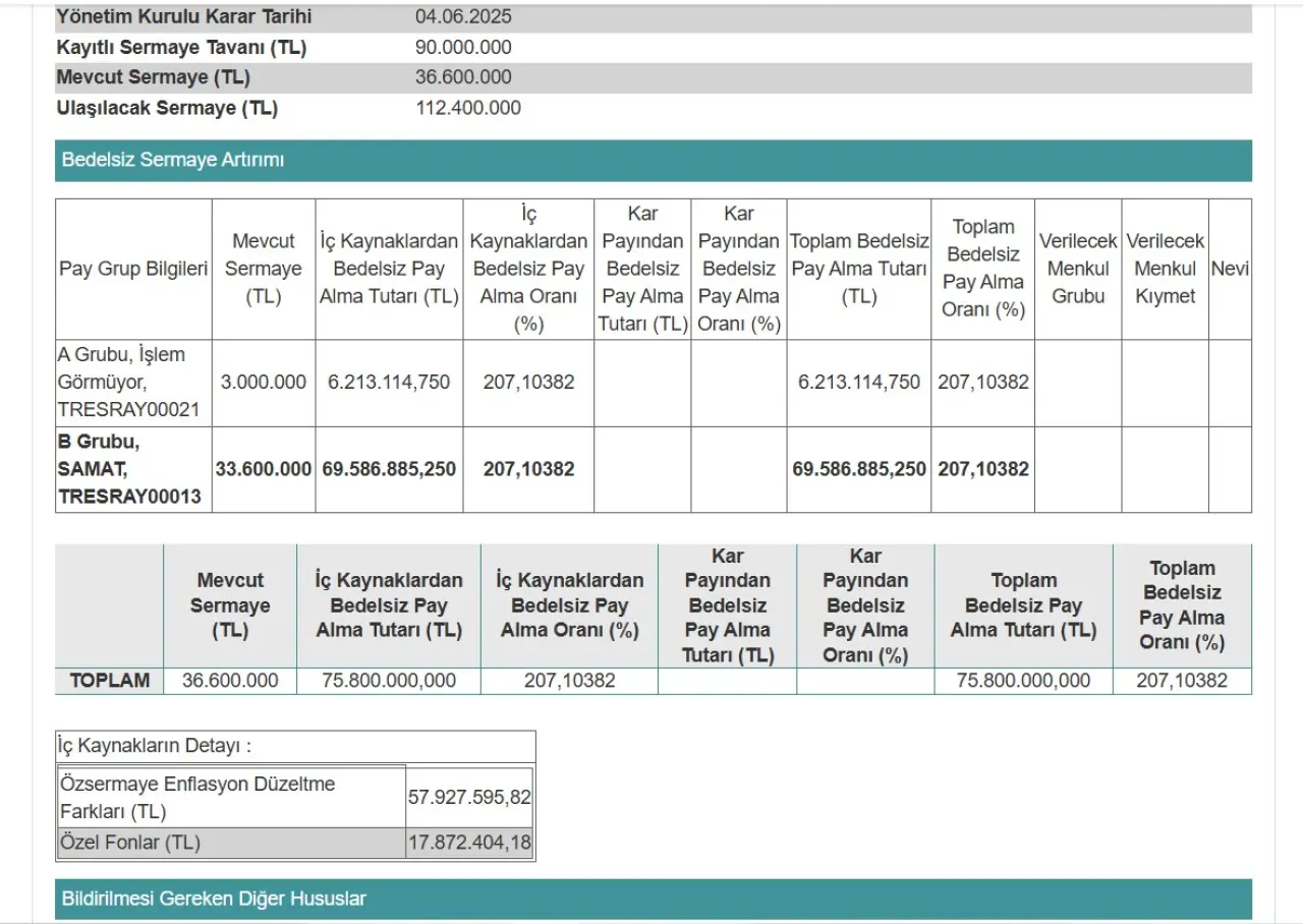 SAMAT Hisse Yüzde 207 Bedelsiz Sermaye Artırımı İçin Onay Geldi