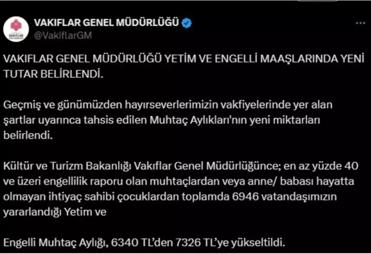 Kültür ve Turizm Bakanlığı Vakıflar Genel Müdürlüğü, 8 Temmuz 2025: Kültür ve Turizm Bakanlığı'na bağlı Vakıflar Genel Müdürlüğü, yetim ve engelli muhtaç aylıklarının tutarını artırdı. Yeni düzenlemeyle, bu ödemeler 6.340 TL'den 7.326 TL'ye yükseltildi.