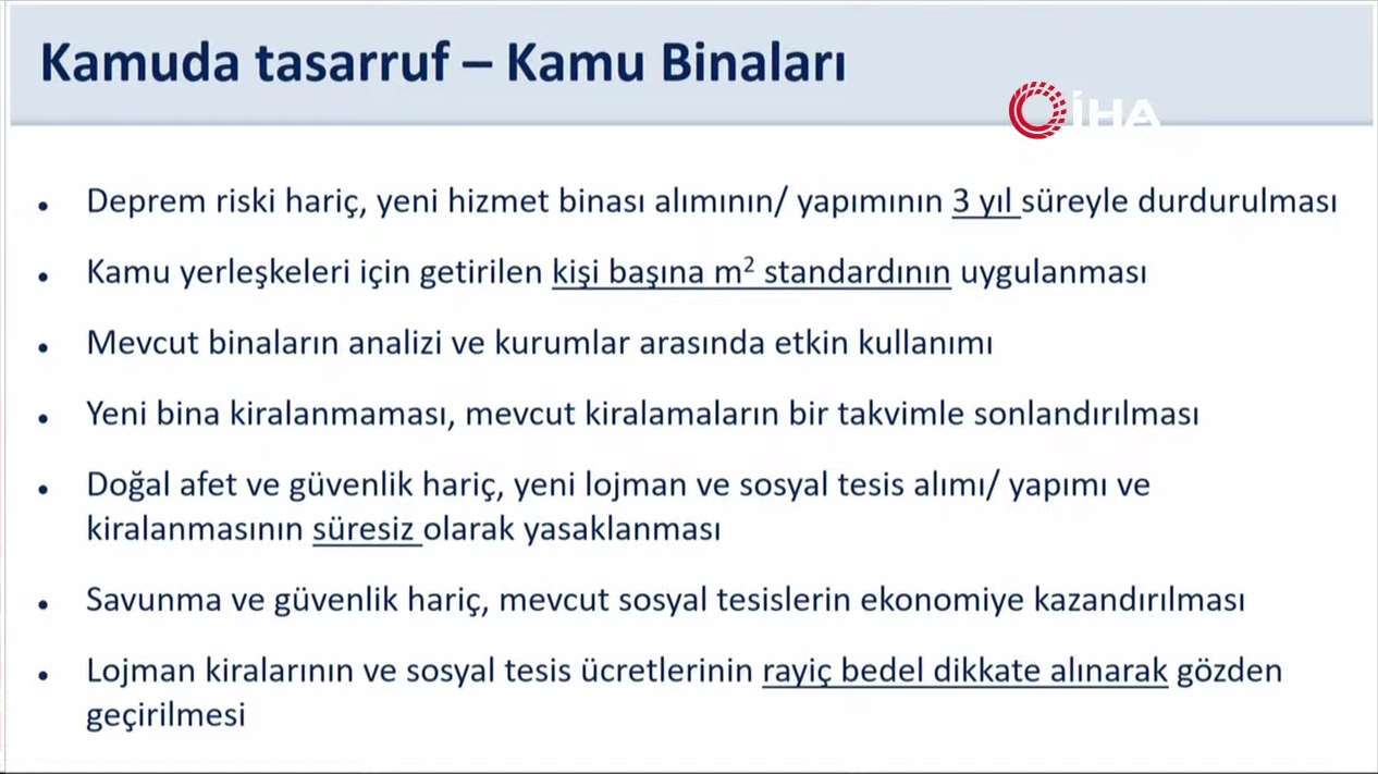 - Doğal afet ve güvenlik hariç, yeni lojman ve sosyal tesis alımı/ yapımı ve kiralanmasının süresiz olarak yasaklanması