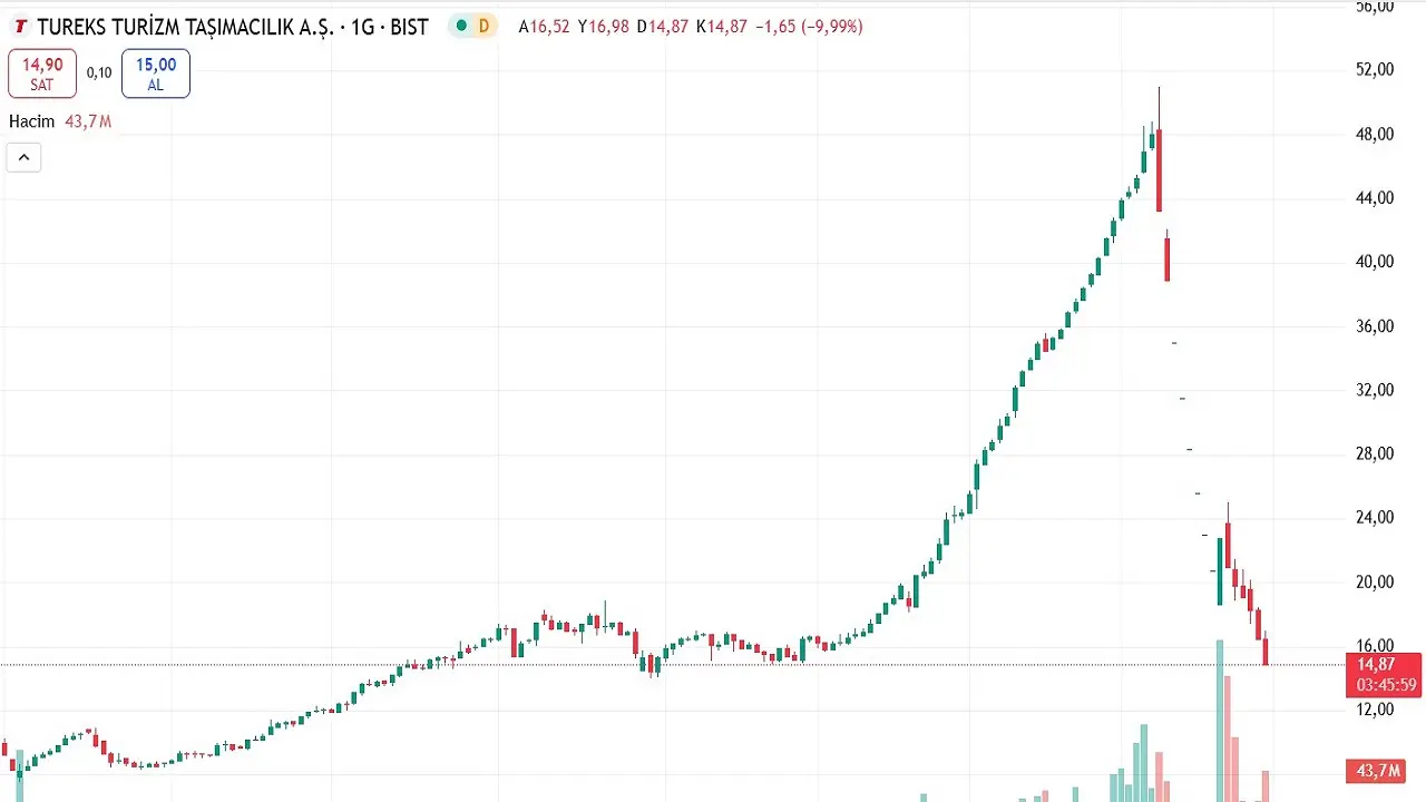 2024 yılının 2.yarısında başladığı yükselişi, 2025 yılının ilk çeyreğine de taşıyan TUREX tahtası, 8 lira civarından başladığı hareketle 50 liranın üzerine kadar tırmanmış ve takribi 1 yıllık süreçte 6 kattan fazla primlenmişti. Mayıs ayı başında zirve gören hissede kar satışları başladı.