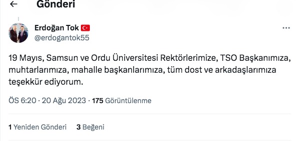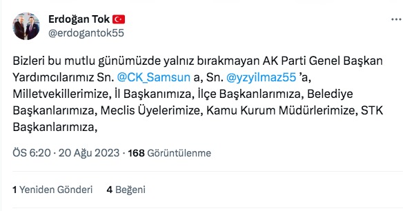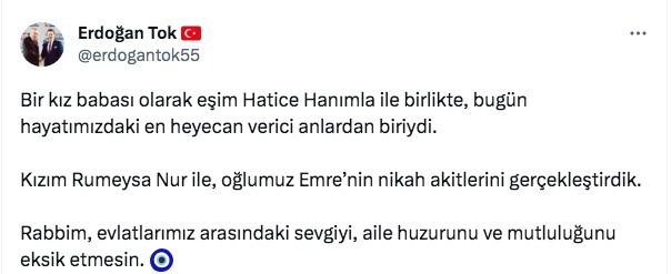 Erdoğan Tok'un kızı Rumeysa Nur Tok ve Emre Bulut'un nikahını Tekkeköy Belediye Başkanı Hasan Togar kıydı. Çiftin nikah şahitliğini ise düğüne katılan protokol üyeleri yaptı.
