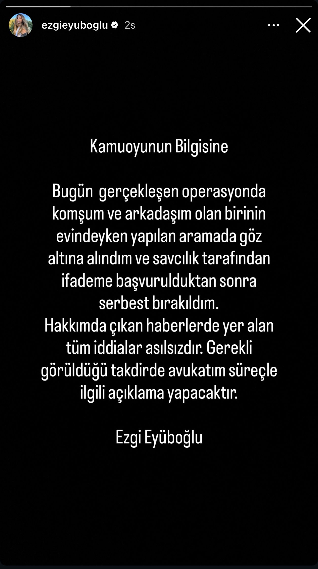 Ünlü oyuncu paylaşımında, herhangi bir şüpheli konumda olmadığını vurgulayarak, operasyonun kendisiyle ilgili olmadığını ifade etti. Açıklamasında, yalnızca bulunduğu ortam nedeniyle sürece dahil edildiğini belirten Eyüboğlu, savcılık makamına verdiği ifadenin ardından serbest kaldığını kaydetti.