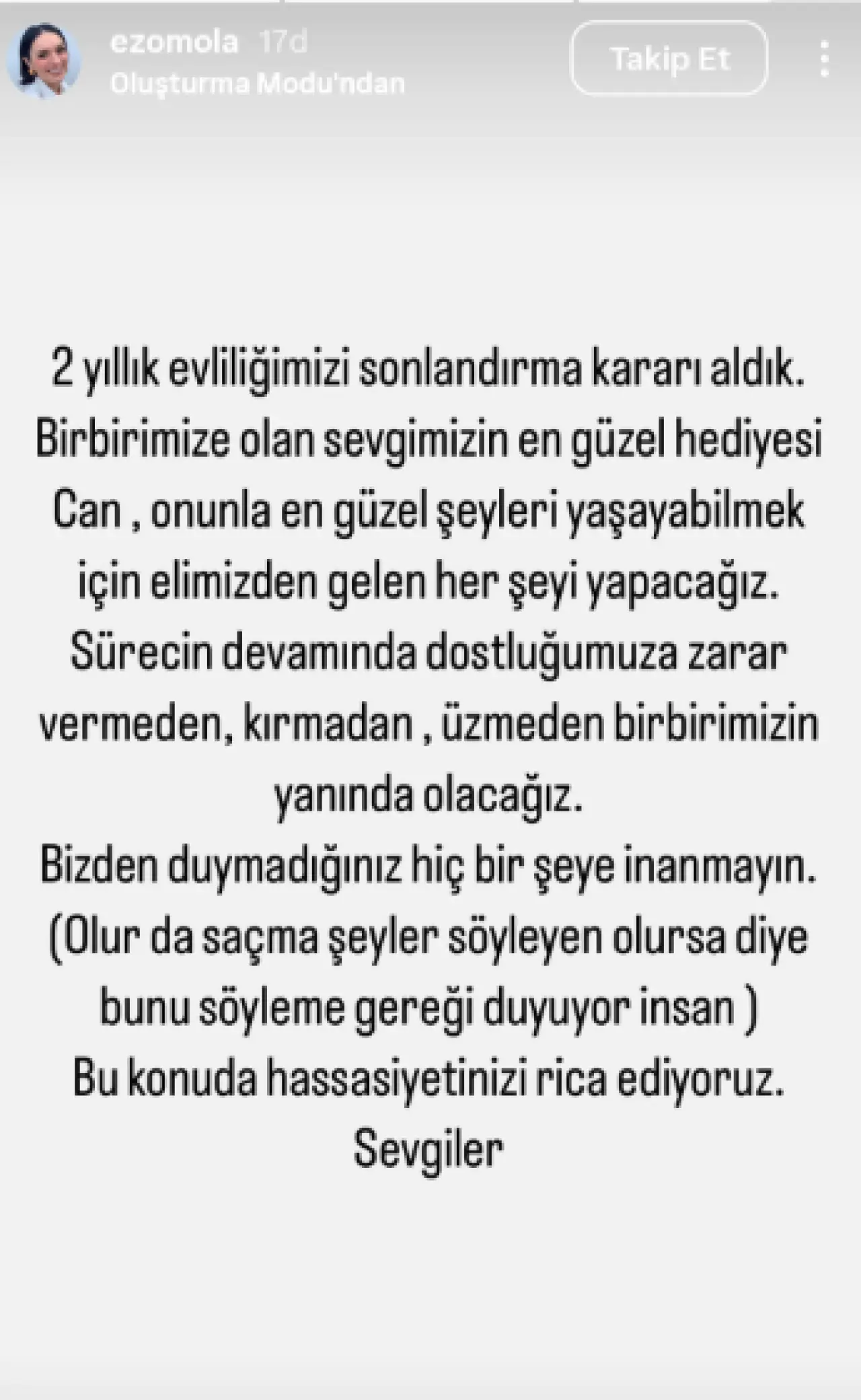 2 yıllık evliliğimizi sonlandırma kararı aldık. Birbirimize olan sevgimizin en güzel hediyesi Can. Onunla en güzel şeyleri yaşamak için elimizden gelen her şeyi yapacağız. Sürecin devamında dostluğumuza zarar vermeden, kırmadan, üzmeden birbirimizin yanında olacağız. Bizden duymadığınız hiçbir şeye inanmayın. (Olur da saçma şeyler söyleyen olursa diye) bunu söyleme gereği duyuyor insan... Bu konuda hassasiyetinizi rica ediyoruz. Sevgiler.”
