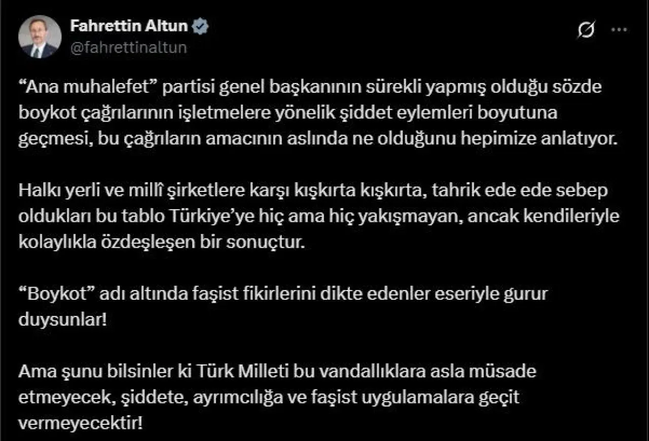 İletişim Başkanı Fahrettin Altun, sosyal medya üzerinden yaptığı açıklamada, son günlerde ana muhalefet partisi genel başkanının yaptığı boykot çağrılarını ve bunların yol açtığı şiddet eylemlerini sert bir şekilde eleştirdi. Altun, bu tür çağrıların halkı yerli ve milli şirketlere karşı kışkırtarak, Türkiye’nin imajına zarar verdiğini belirtti.